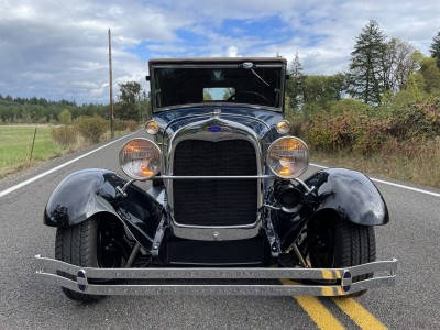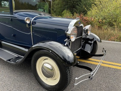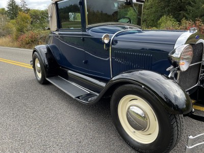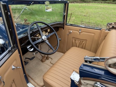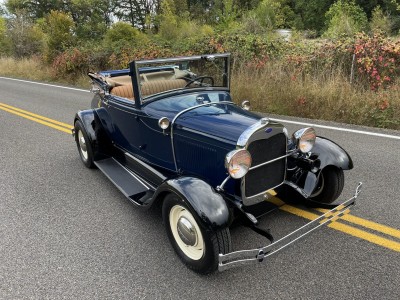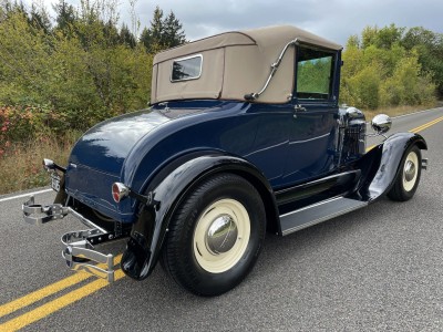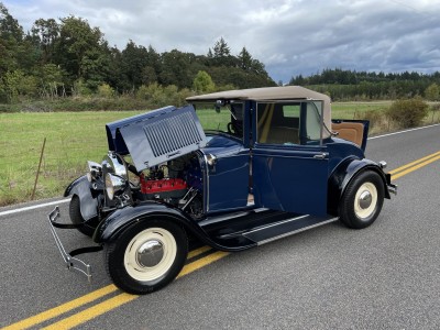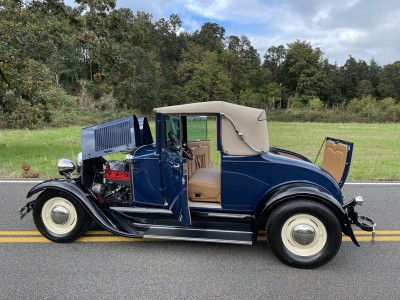 This 1929 Ford Model A cabriolet is finished in Washington Blue over tan leather, and it is powered by a replacement 201ci inline-four paired with a three-speed manual transmission. Equipment includes a Speed Head II cylinder head, a Speedway Motors front drop axle, a Stromberg carburetor, a tan canvas soft top, cowl-mounted spotlights, 15″ steel wheels, hydraulic brakes, and a tilt-out windshield.