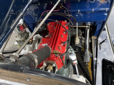 The replacement 201ci inline-four has been modified with a red-painted Speed Head II cylinder head, an aluminum intake, an aftermarket stainless-steel header, a Stromberg carburetor, and a 12-volt conversion. The car is equipped with an alternator, an electric fuel pump, a 16-gallon fuel tank, and an aftermarket distributor that is said to eliminate the need for spark-advance manipulation on start-up. The selling dealer notes that the car is still in its break-in period.