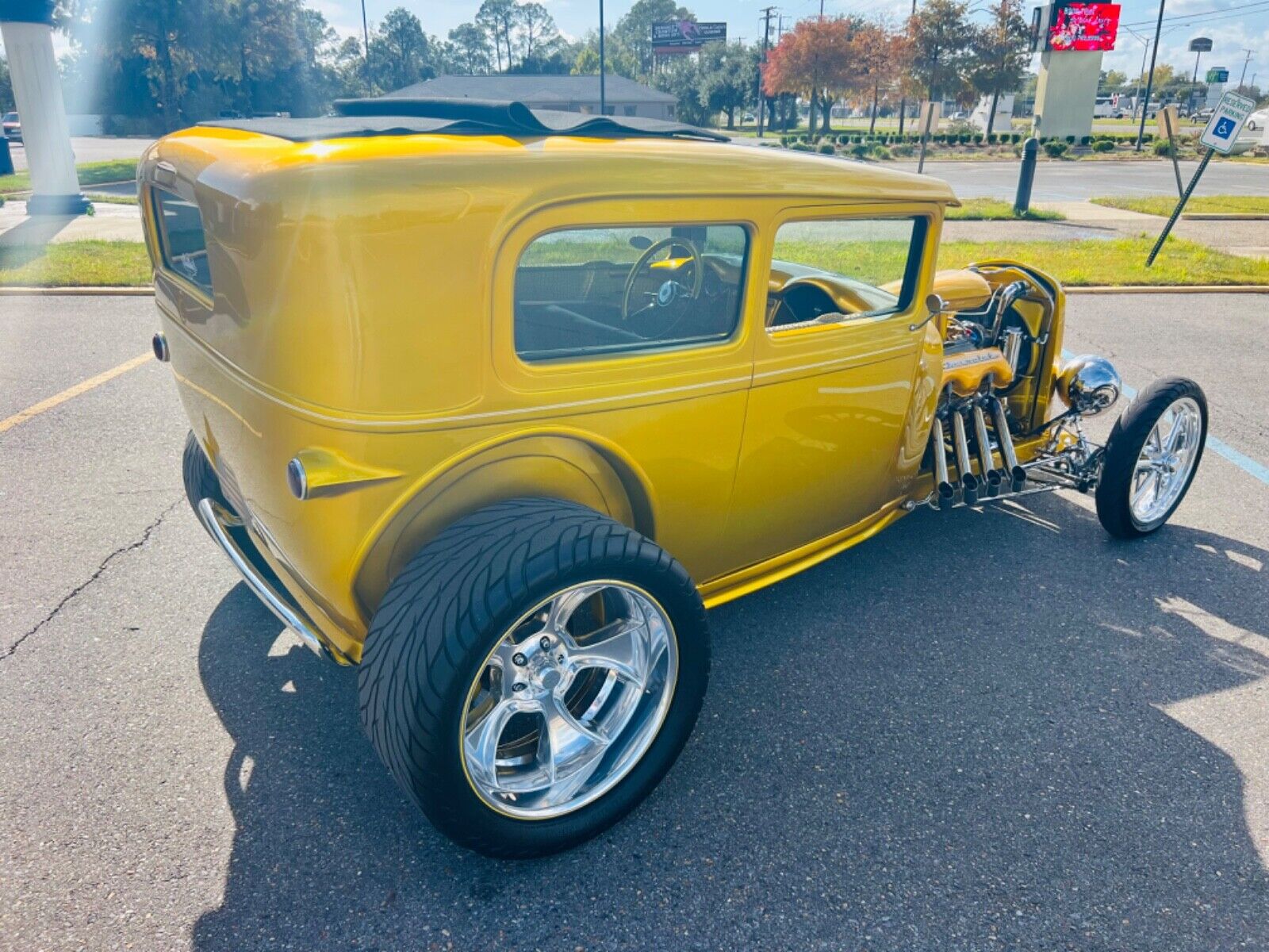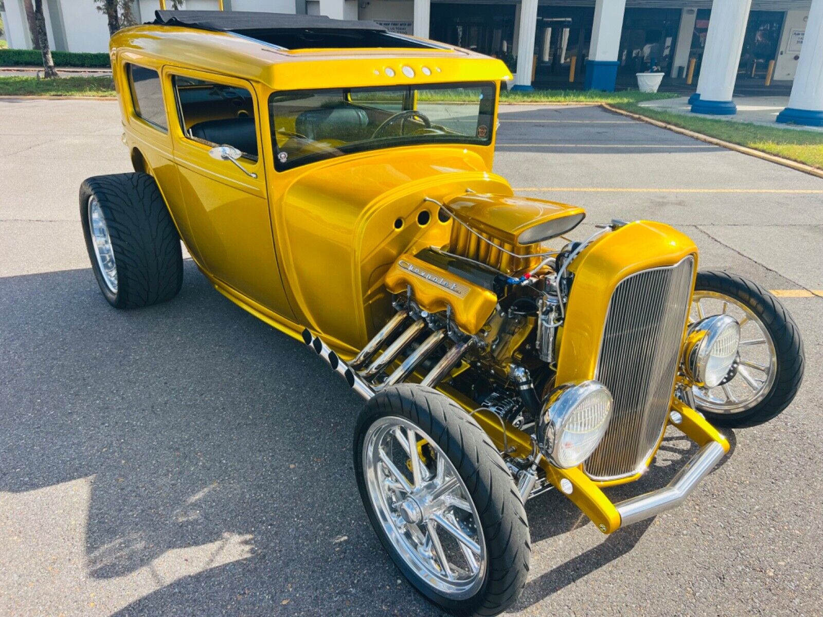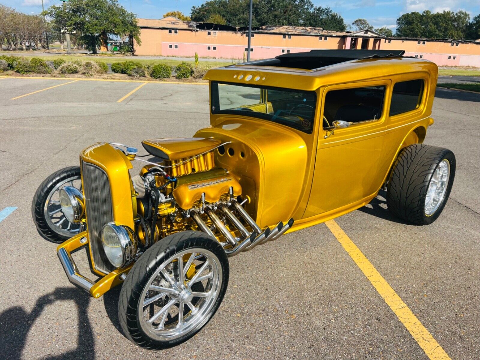 Stunning, high-end custom 1929 Ford Model A built for World of Wheels. All-steel body with extensive modifications, custom chassis, and flawless House of Kolors candy gold metallic paint. Powered by an LS1 engine with custom covers, automatic overdrive transmission, and modern performance upgrades throughout. Features include chopped top, custom Bel Air dash, power steering, Wilwood disc brakes, chrome suspension, polished wheels, sunroof, and a full custom gator and black leather interior. Show-quality inside and out—beautiful, unique, and ready to impress.