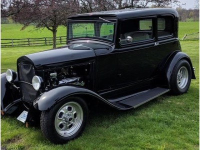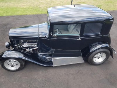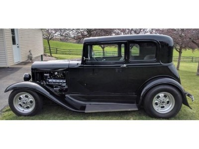 This custom 1931 Ford Victoria street rod features a 1967 Chevrolet 327ci V8 engine (bored .030 over) paired with a TH350 3-speed automatic transmission. Finished in glossy PPG Delstar black with Polyform fiberglass fenders, it sports Cragar wheels, halogen lights, and a sleek flush-fit body. The updated interior includes gray cloth and vinyl upholstery, Vintage Air climate control, power windows, and Classic Instruments gauges. Built on a Lobeck frame with a Superbell front axle, 4-link suspension, and Ford 8-inch rear end, this Victoria combines vintage style with modern performance and comfort