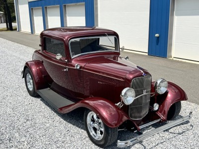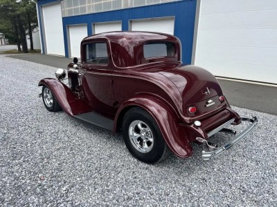 This 1932 Ford Street Rod is a striking example of modern craftsmanship combined with classic styling. Built in 2016, it features a fiberglass three-window coupe body with a steel hood and grille, all finished in a stunning maroon with beige pinstripes. Under the hood, you'll find a 350ci Chevy V8 with dual four-barrel carburetors, mated to a three-speed automatic transmission. The car is equipped with independent front suspension, front disc brakes, and 15" Torq Thrust wheels. The light beige interior includes power windows, Vintage Air climate control, and a tilt steering column. With just 8,000 miles since its build, this street rod offers both performance and style, complete with a meticulously maintained engine and a striking appearance.