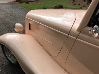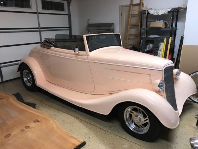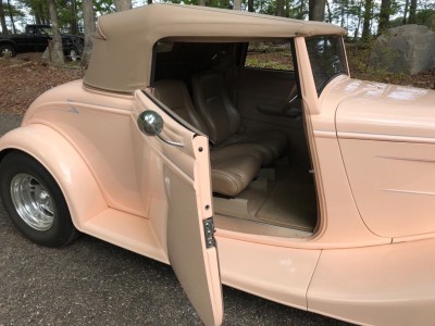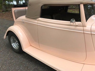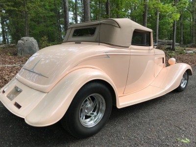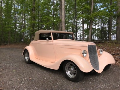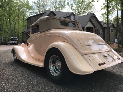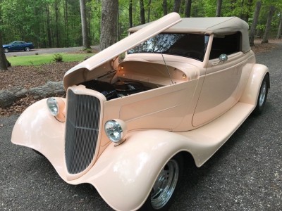 Beautiful 34 Ford Cabriolet ready to cruise! Newly installed Chevy 350 290 hp crate motor, A/C, 400 turbo trans all power, painted in PPG sweet Georgia peach with nice hand painted pinstripe, leather custom seats, cruise control , all chrome dropped front axle, 4 link rear, power rear seat, suicide doors, built with steel fenders running boards, hood, and rear apron, stainless exhaust with aluminized manifolds, turnkey beautiful street rod with 3000 hours of build labor