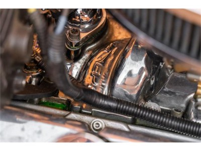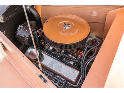 Power is provided by a 383ci V8 engine paired with aluminum heads and a TH350 three-speed automatic transmission. Underhood features include aluminum valve covers, a polished aluminum intake, a chrome air cleaner, a smoothed body-color firewall, and block-hugger headers.