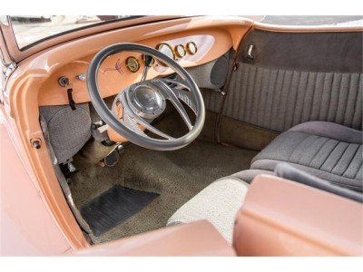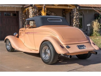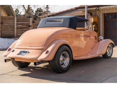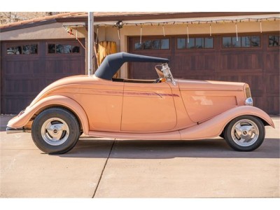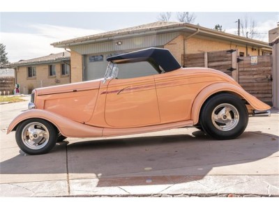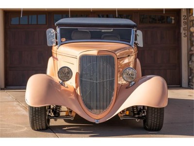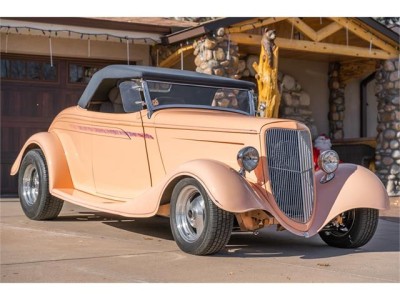 This fiberglass-bodied 1934 Ford Roadster is powered by a 383ci V8 engine equipped with aluminum heads and a TH350 three-speed automatic transmission. Features include a Mustang II independent front suspension with rack-and-pinion steering, a power-opening trunk lid, power bucket seats, a tilt steering column, and a Pioneer AM/FM/CD stereo. Refinished in champagne with pinstriping over a gray cloth interior, this 1934 Ford is available now and comes with service records and a clear Colorado title in the seller's name.