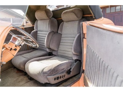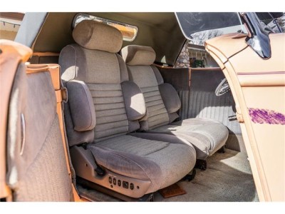 Under previous ownership, the Raven Industries fiberglass body and fenders were refinished in champagne six years ago. Features include a color-keyed grille shell, chrome headlight buckets and stands, a three-piece hood, a chrome windshield with wind wings, side accent pinstriping, a black removable hard top, a power-actuated trunk lid, dual teardrop taillights with blue-dot lenses, and a rear fuel filler.