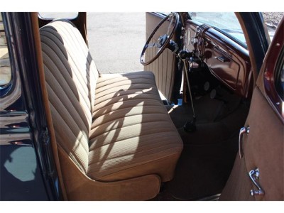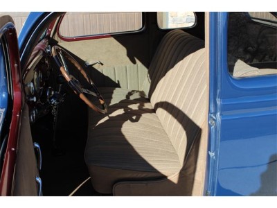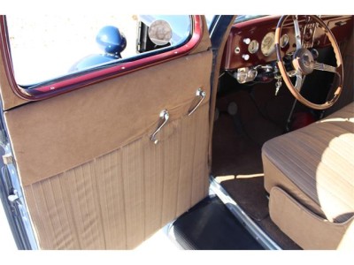 interior is beige cloth with brown carpeting and painted maroon dash. Banjo steering wheel, updated 36 Ford electric gas gauge and supplemental under-dash Stewart Warner temperature and oil pressure gauges.