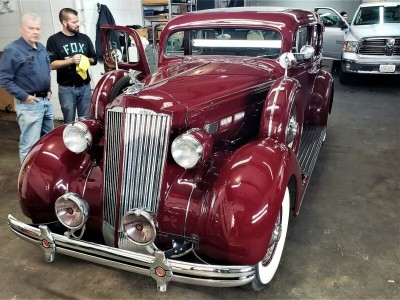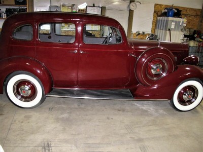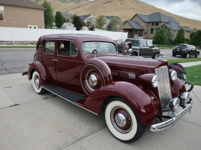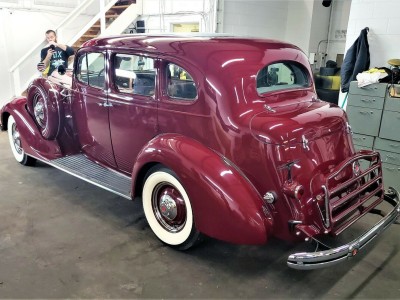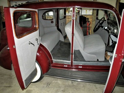 This 1936 Packard 120B Touring Sedan exemplifies pre-war American luxury and engineering excellence. Powered by a 282 cubic-inch straight-eight engine, it runs smoothly and remains remarkably original, featuring pristine bodywork, interior, and even its rare factory dust shrouds. Equipped with seldom-seen luxury options—such as oversized fog lamps, side-mounted spares, dual mirrors, a Jaeger glove box clock, AM radio, and a fold-down chrome luggage rack—this Packard radiates elegance. Its flowing fenders, long hood, wide step boards, and signature tall chrome grille with the goddess hood ornament create the stately
