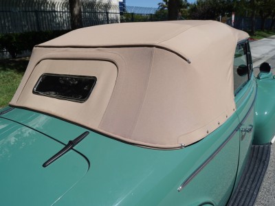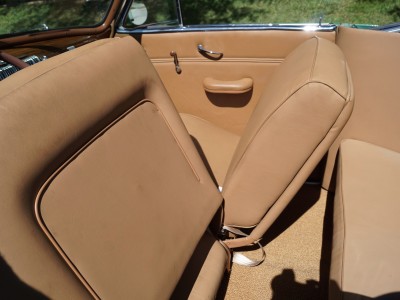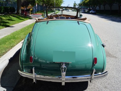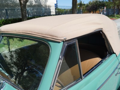 This particular car has been beautifully restored and finished in a striking 'Light Green' color with a light brown leather interior and matching convertible soft top.