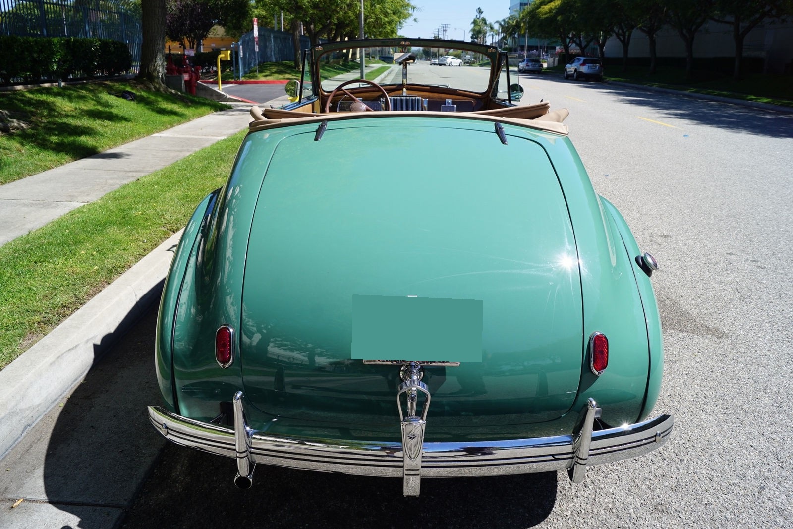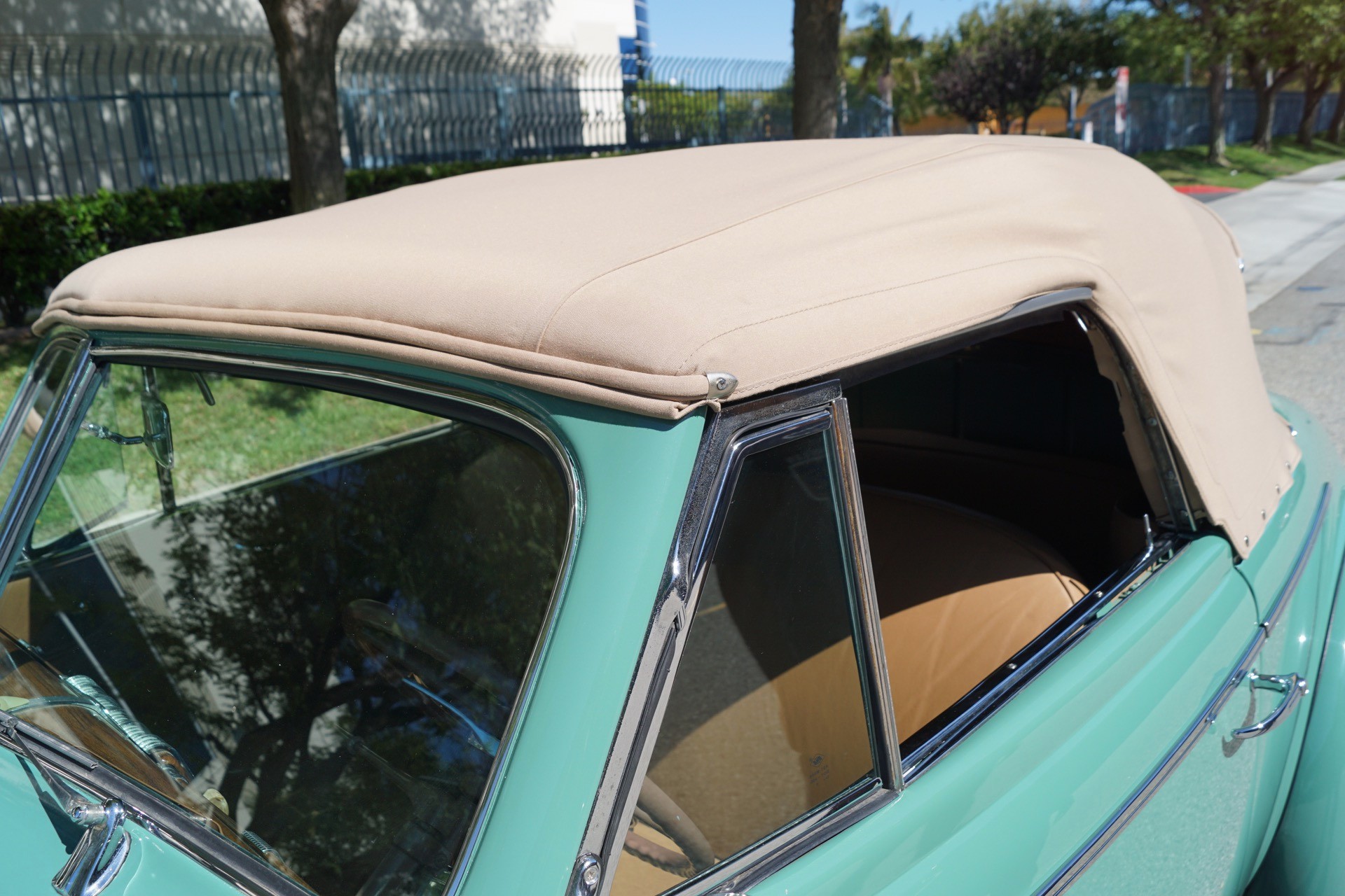 This particular car has been beautifully restored and finished in a striking 'Light Green' color with a light brown leather interior and matching convertible soft top.