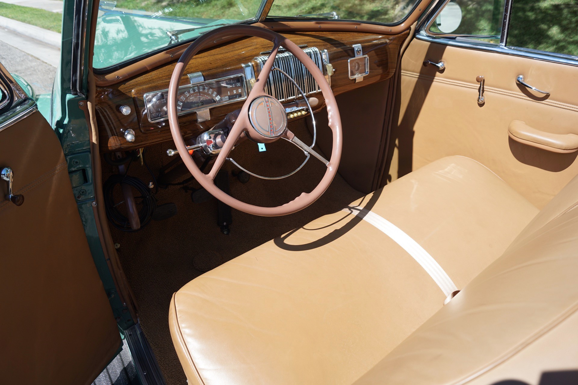 A two-tone woodgrained instrument panel surrounded an arched speedometer and auxiliary gauges while a clock graced the glovebox door and a chromed radio grille was positioned in the center.