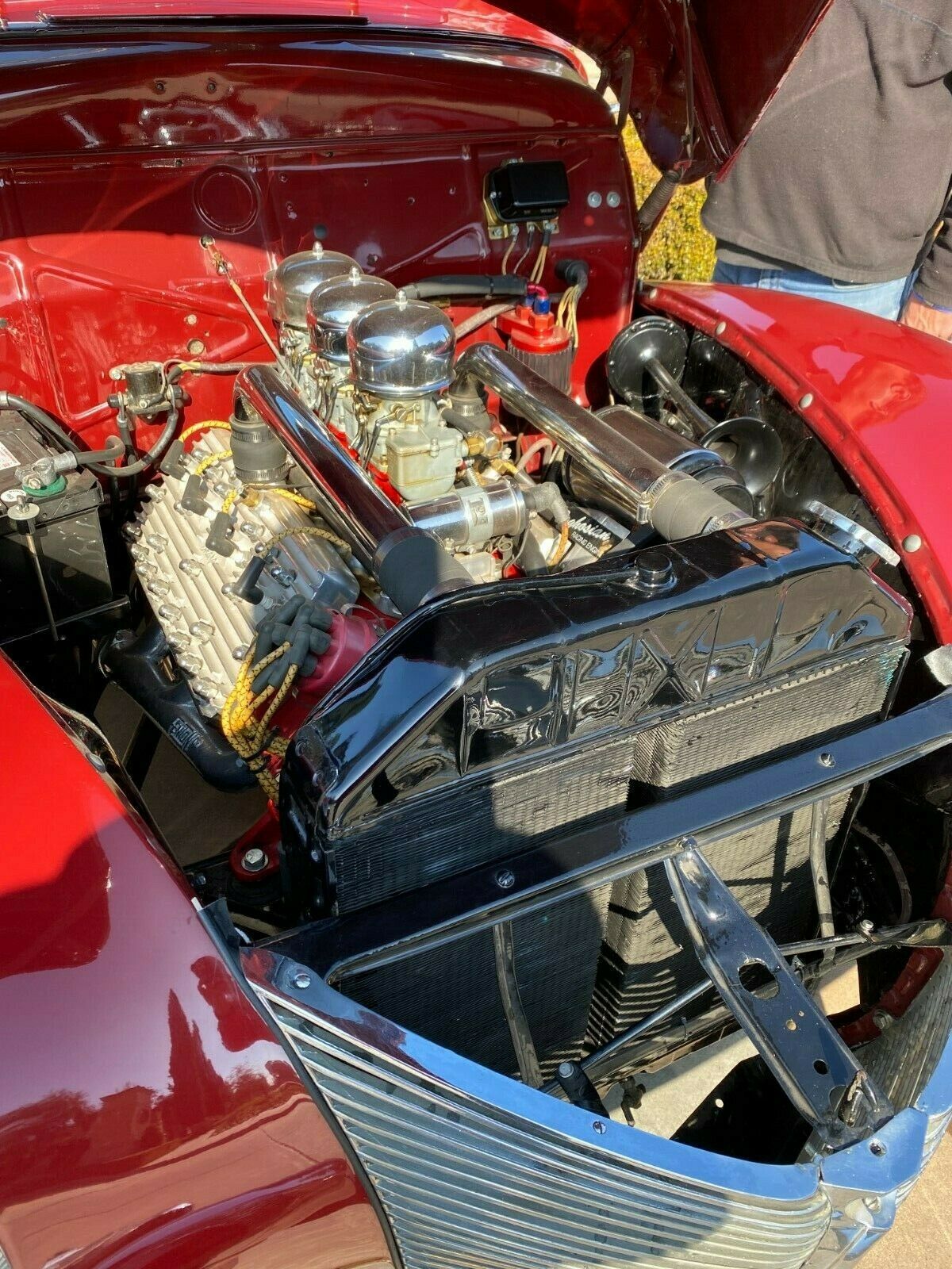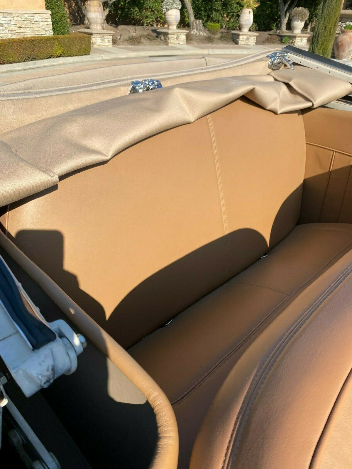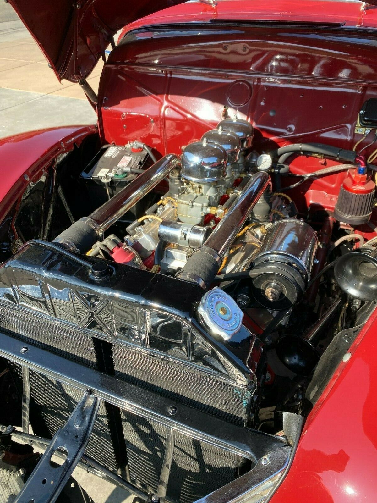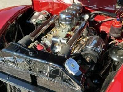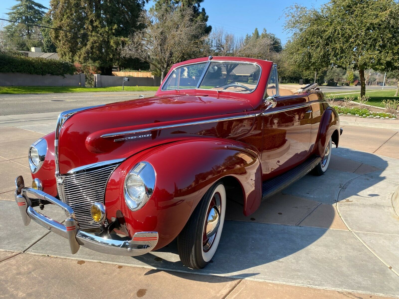 Immaculately painted in period correct Mercury Maron. Chrome is in excellent shape, new top that works fantastic and looks great up or down. All metal panels are straight and rust free. The tan canvas convertible top has a clear rear window. New pie crust wide white radials are covered in the center with chromed deep-dish rims, steel wheels, and dog dish chromed centers.