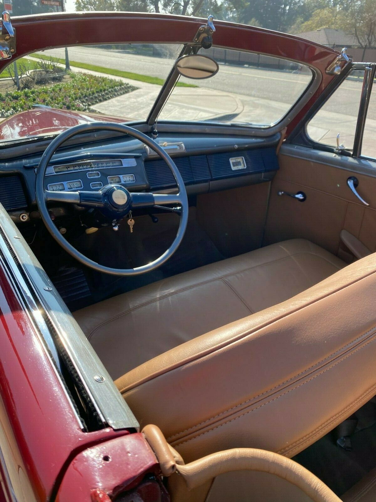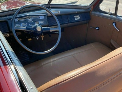 Original and correct and working gages. The entire dash is metal and includes a rectangular art deco styled clock and original working AM radio. The original steering wheel in a heavier banjo style complete with wings in its center. Tan interior seats both large benches the front sporting a split back for easy access to the rear bench. Door panels are a matching tan inside.