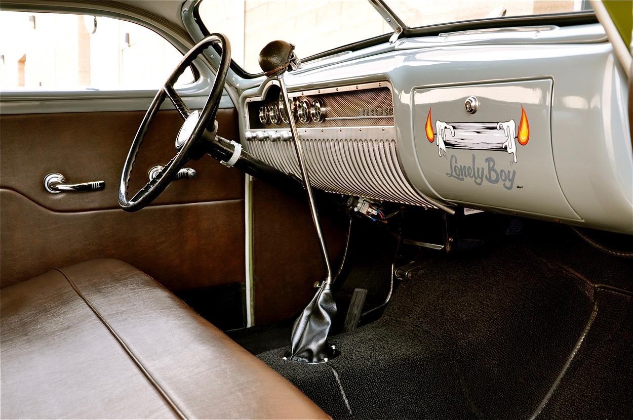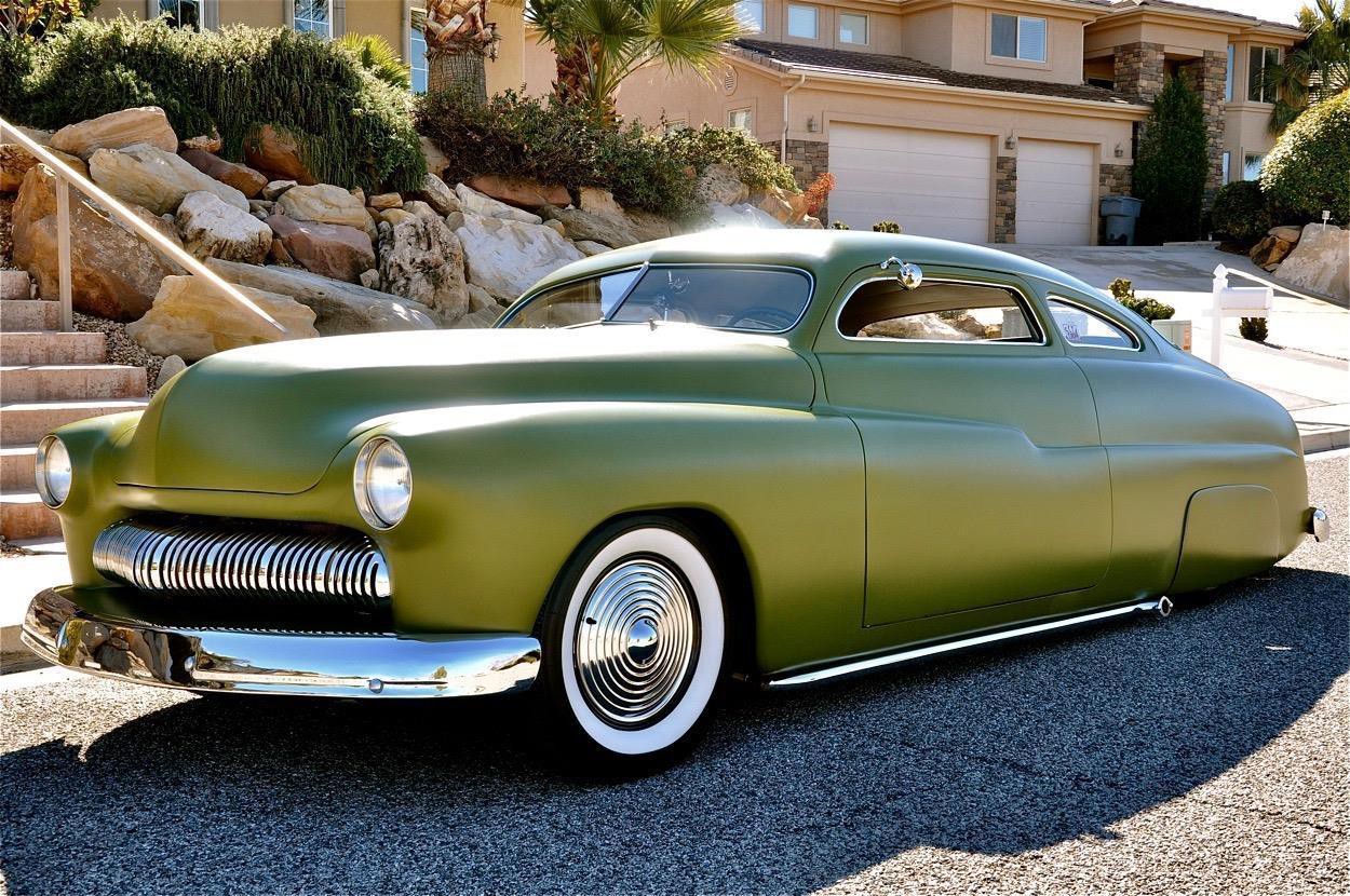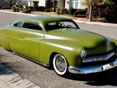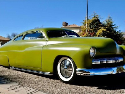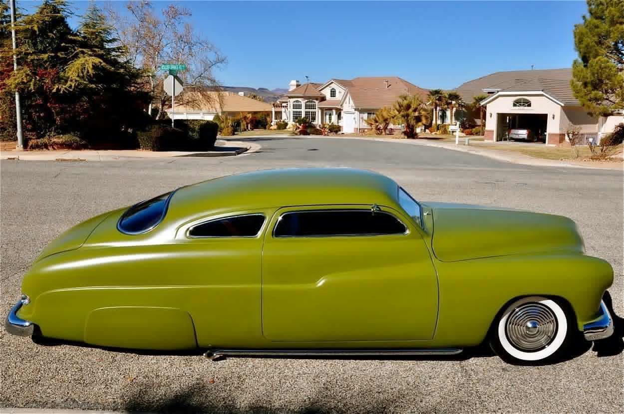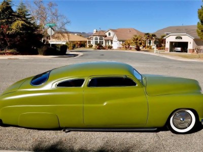 This 1950 Mercury Coupe is very well known worldwide and its history is very special indeed. After sitting in a field in Idaho since the early 1960’s, painter/illustrator/graphic designer Max Grundy, acquired this the Mercury Coupe, and started what was to become a 13 year venture of building his ‘dream’ car. He was 19 years old at the time, and always dreamed of building a custom Mercury, as his father had done when Max was just a little boy. When he first got the Merc, it had very faint lettering on the jockey box that read ‘Lonely Boy’, a name that stuck, hence the cool logo with the candle burning at both ends. Anyway, Max, with the help of his father and brother, started chipping away at the Merc immediately after getting it home, but there was only so much they could do with their limited experience, so it was decided to take the Merc to Bo Huff in Dragerton, Utah to get the body work started. After Bo did the initial chop, it sat in Max’s parents garage in Utah for another five years before Max brought it back to Southern California to finish what he had started. Max took his Merc to Aaron Valencia, who completed the bodywork and along w/ Max, turned Max’s car into one of the meanest Kustom Mercs on the planet! She was chopped 5.5”, nosed, decked, everything was shaved, and ’54 Ford frenched headlights were added. She was then finished in an ultra-cool shade of Military Matte Green, which gives this car that ominous appearance like no other. Pop open the door and you immediately notice that the Military vibe carries over into the interior, with the bench seat finished in an Army brown style w/ Battleship Grey dash & upper doorframes. If you’ve ever seen Max Grundy’s work, then you know that much of his art has a WWII theme, which he carried over while designing this 1950 Mercury Coupe. The interior qualities match the exterior perfectly, with its colors & design very much thought out ahead of time. The Battleship Grey dash was customized beautifully and has an aircraft feel that is impossible to deny. Interior features include: full set of Classic Instruments gauges, Aircraft type switches & Riveted Panels, ’55 Ford Steering Wheel, Hand-Built Steering Column, Genie 23” Shifter w/ Custom Shift Knob, Original Heater (functional) and ‘Lonely Boy’ logo artwork on glove box. Again, the interior matches the one-of-a-kind exterior perfectly. All of the gauges, lights, blinkers, etc., are in perfect working order. Sitting on a 1972 Pontiac GTO chassis, w/ GTO suspension, steering & brakes, this Mercury Coupe drives like a dream! Powered by a 400ci SBC motor featuring: Cal-Custom Finned Valve Covers, Chrome Block Hugger Headers, Cadillac Air Cleaner, Edelbrock Intake Manifold, Edelbrock 600 cfm Carburetor, Chrome Alternator and custom built Aluminum Radiator w/ Dual Fans, she performs as good as she looks! The 400 SBC is linked to a TH400 3-Speed Automatic Transmission which shifts super smooth & crisp with no unwanted noises whatsoever. She fires up instantly, settling into a nice smooth idle, and she runs & drives beautifully in every way. The 400ci SBC provides plenty of power & torque, making the car is an absolute BLAST to drive, and the lake pipes are completely functional & sound incredible! In fact, if you look at the Mooneyes Catalog, you will find the ‘Lonely Boy’ featured in the lake pipe section. This Merc also has the perfect stance, sitting on 15” steel wheels with Mooneyes Starburst Discs wrapped in Coker Classic Whitewall tires. Of course, she’s got an Air Ride system in the rear, so you can completely control where you want her to sit at all times. From any angle, whether it’s day or night, this Chopped Merc looks perfect, period. This is a very rare opportunity to own a very special 1950 Mercury Coupe that has been owned and customized by some of the biggest names in the Kustom Kulture world. It has been painted and/or drawn by some of the most well-known Automotive Artists on the planet, and has been recognized as one of the prolific 1950 Mercury Coupes on earth! There is a plethora of information on the Internet regarding this very special car; simply google ‘Max Grundy Mercury’ and you’ll see what I mean. As a topper, several of the original paintings will also be included in the sale. If you have been searching for a one-of-a-kind classic car that is unlike any other out there, and one with a very unique history, then you have certainly found your car!