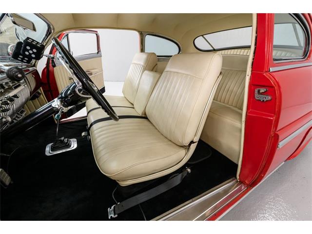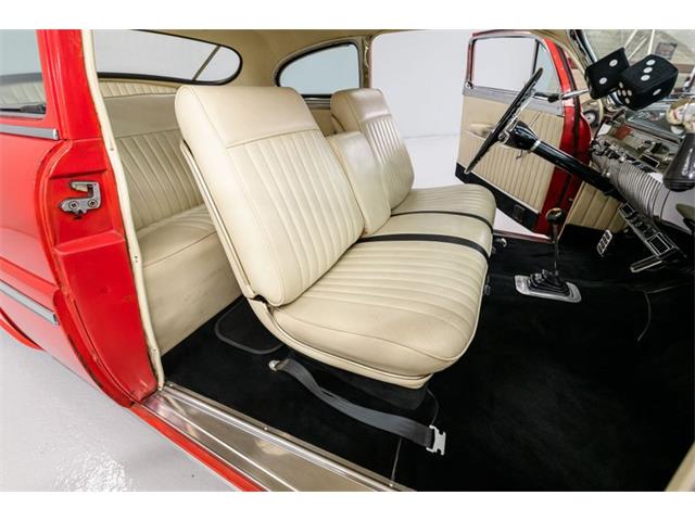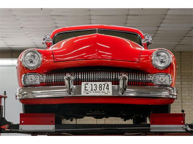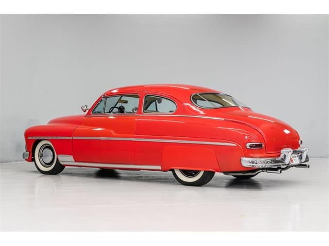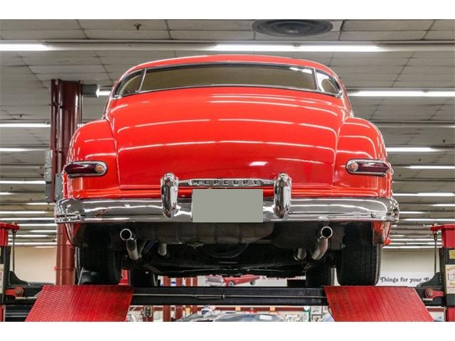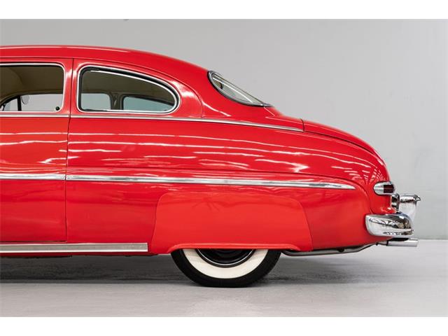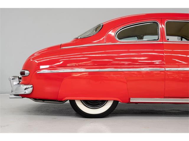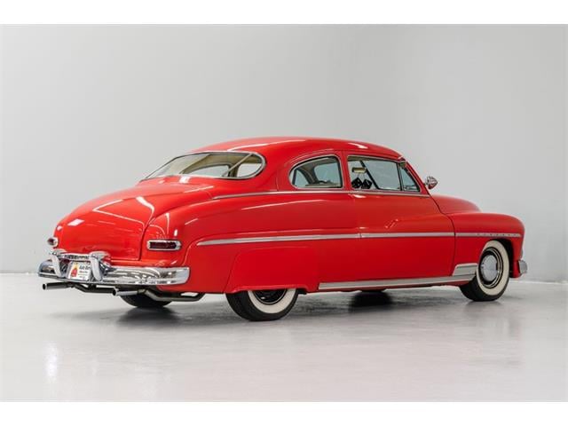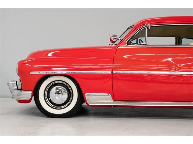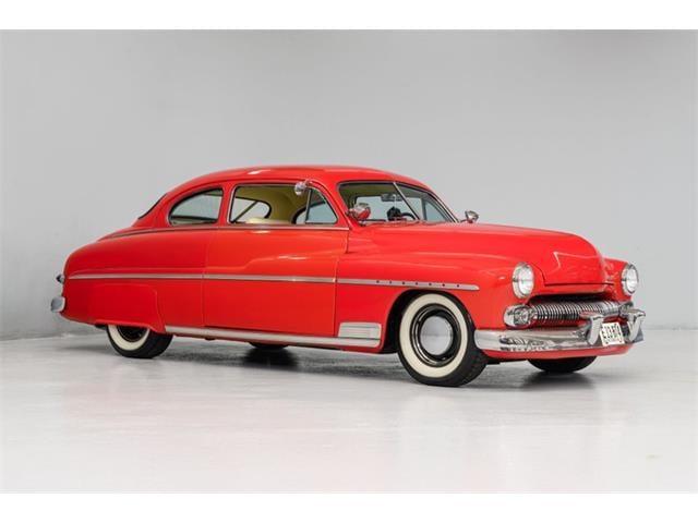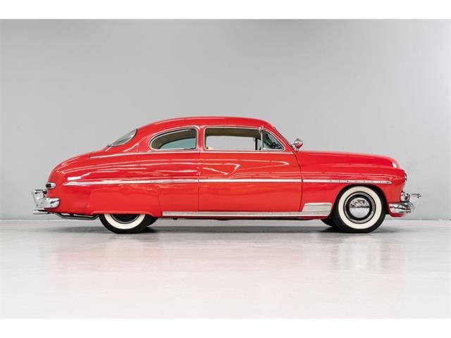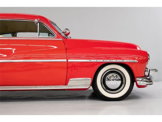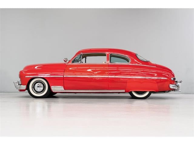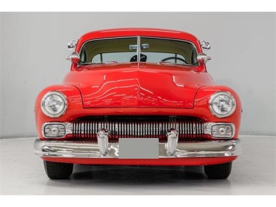 STK 3492 1950 Mercury Eight The Mercury Eight was the first and only model produced by Mercury from 1939 through 1951. The first post-war model was introduced in 1949 with distinctive pontoon styling. This fully enclosed body appearance ended the monotony of warmed-over pre-war styles and sales figures for both Ford and Mercury broke records in 1949. During that era, and beyond, the stylish Lead Sled Merc Eight has always been popular with customizers. This 50 Mercury Eight Coupe has been fully restored with many custom and mechanical upgrades. It received a 2-stage coat of Bright Red (1998) accented with period-correct fender skirts, dual spotlights and steel wheels w/caps, trim rings and wide-whites. All of the chrome, and there is a lot of it, is in very good condition and the doors are fitted with poppers. The interior has been nicely restored in cream vinyl. The front seat is power assisted and a handsome dash is equipped with full factory instrumentation and original radio. The headliner, door panels and carpeting are all in very good condition and a custom floor shift has been installed. Climate control is managed by a professionally installed air-conditioning system and a beautiful 50 Merc steering wheel completes the package. The Mercury is powered by a nicely dressed, rebuilt 350ci Chevy small-block with aluminum intake and Edelbrock four-barrel carburetor. A heavy-duty aluminum radiator has also been installed and exhaust is routed through a custom dual system. This power plant is backed by a GM 3-speed automatic gearbox and factory differential. Both steering and braking are power assisted with large drums on all four wheels. A front sway bar has been installed and all electrics have been upgraded to a 12-volt system.