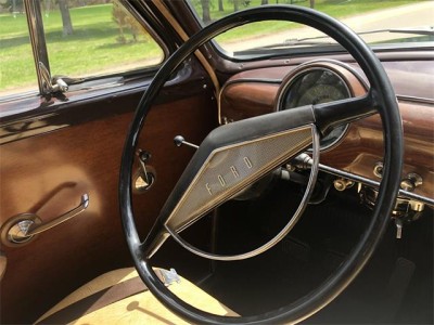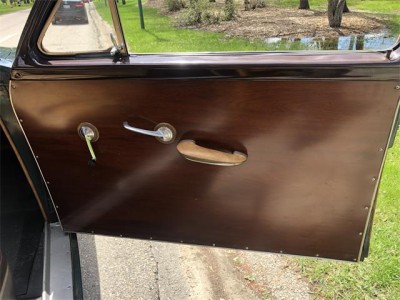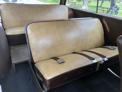 The original wood both inside and out was exceptional with an attractive patina from gentle use. the inner mahogany door panels and simulated wooded dash were like new. the dash was fitted from factory with a clock and pushbutton radio. The floors were covered in the correct rubber matting and the three bench seats and headliner were covered in an attractive tan and dark brown vinyl.