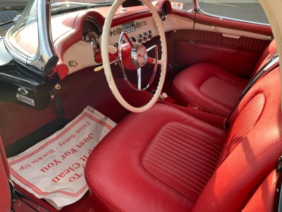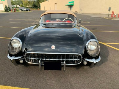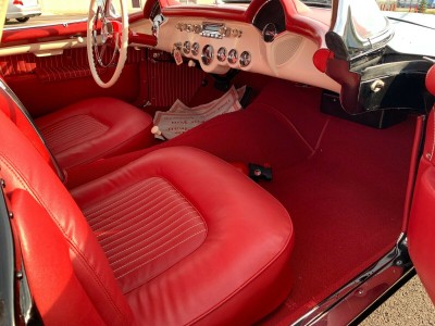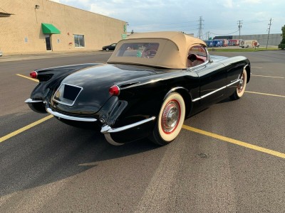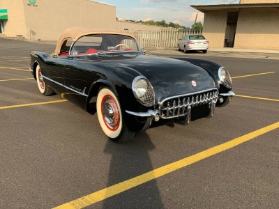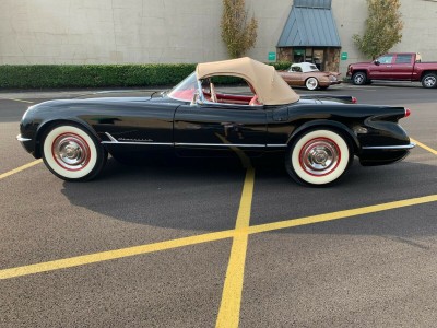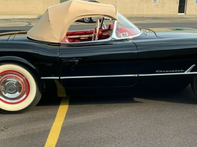 This is a fully frame off restored 1954 Corvette originally white, now finished in black lacquer over red interior. This an original drivetrain, no hit body car, with restored original parts throughout. The underside of the car is restored as beautifully as the rest of the car. Since these pics were taken, a new, correct, reproduction tar top battery has been installed.