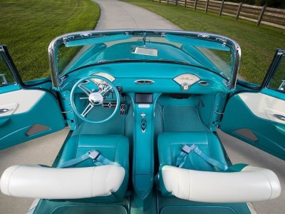 The engine features custom hot rod dynamics fuel rail covers and coil relocation brackets. The firewall has been smoothed with a hot rod dynamics firewall and the hood features a hot rod dynamics stainless support brace. The interior was fabricated using custom dyed leather throughout. The seats are power adjustable and are very comfortable . The center console is fabricated out of steel. The body is finished in turquoise/ India ivory. This car was built by a true group of craftsman. Everything works as you would expect it too, from the air conditioning blowing ice cold, to all power windows and door locks . the top can be operated by remote or by a switch. The fuel door has been shaved and is relocated behind the tail light which is operated by power.