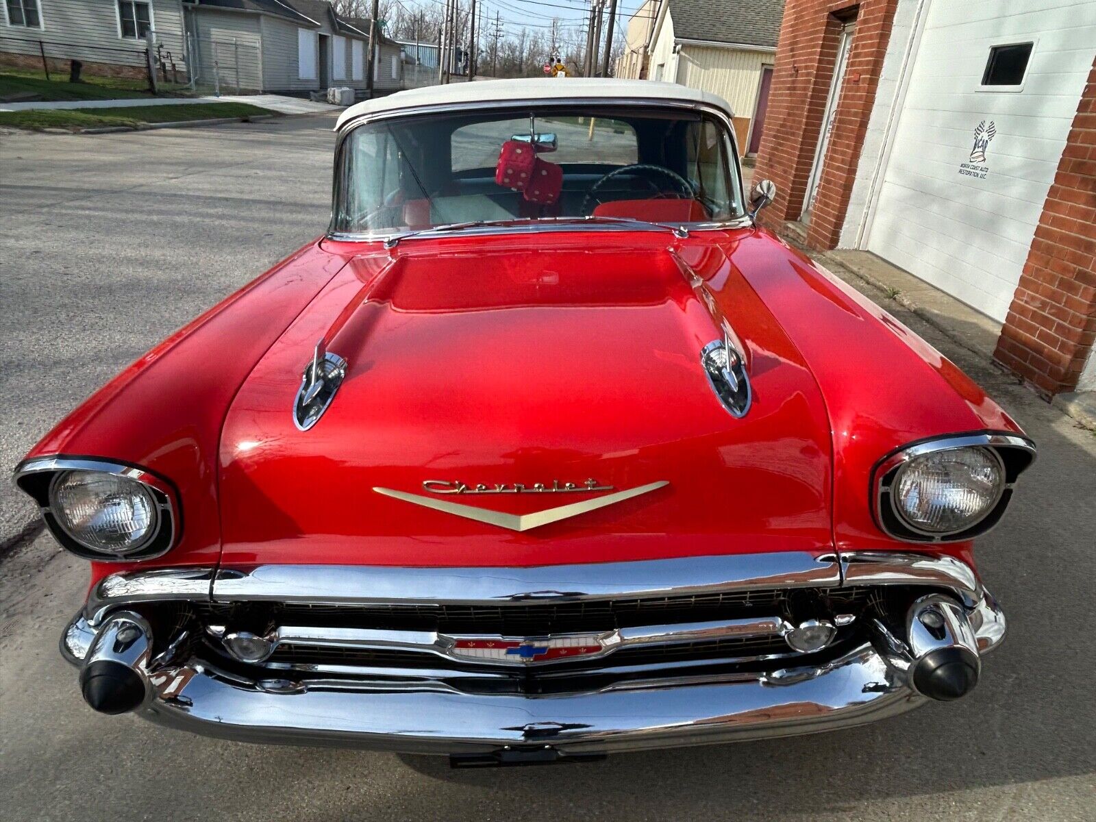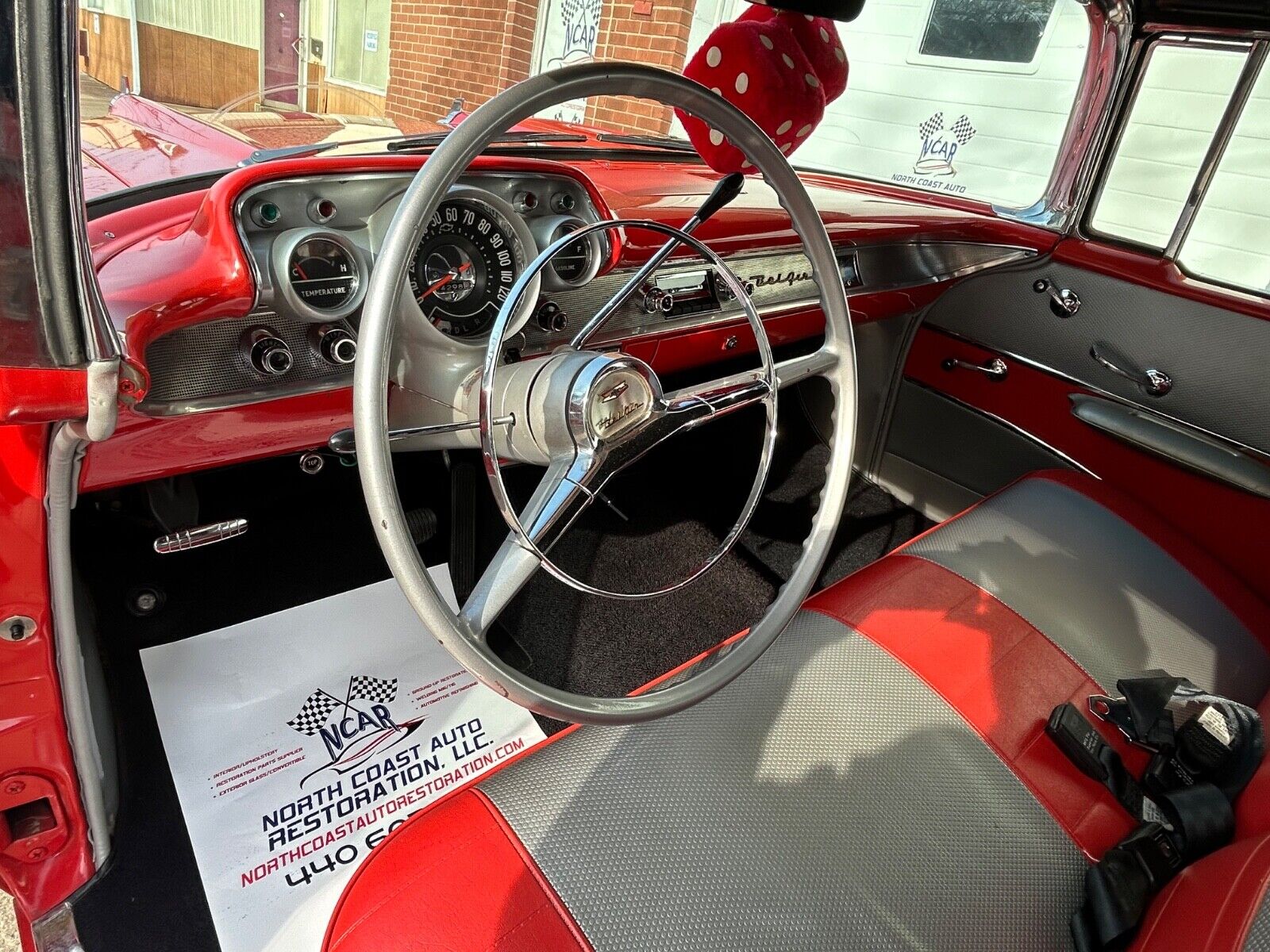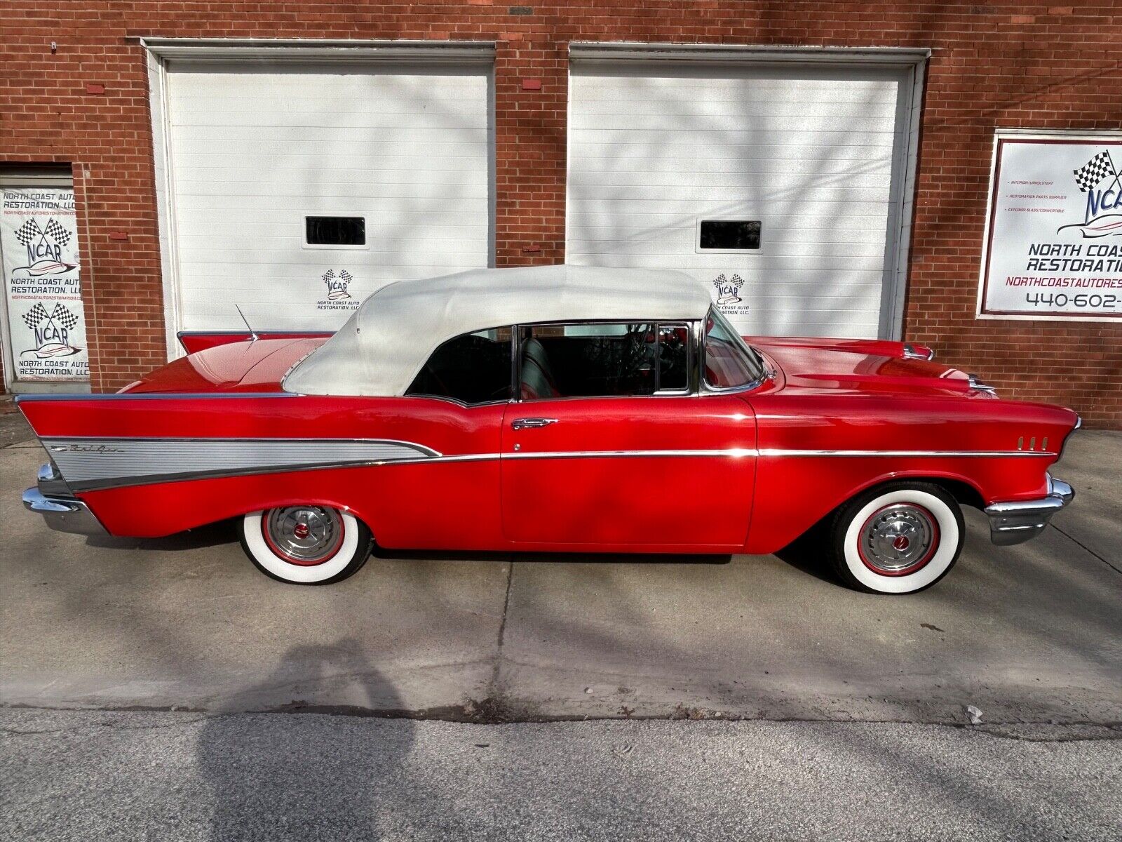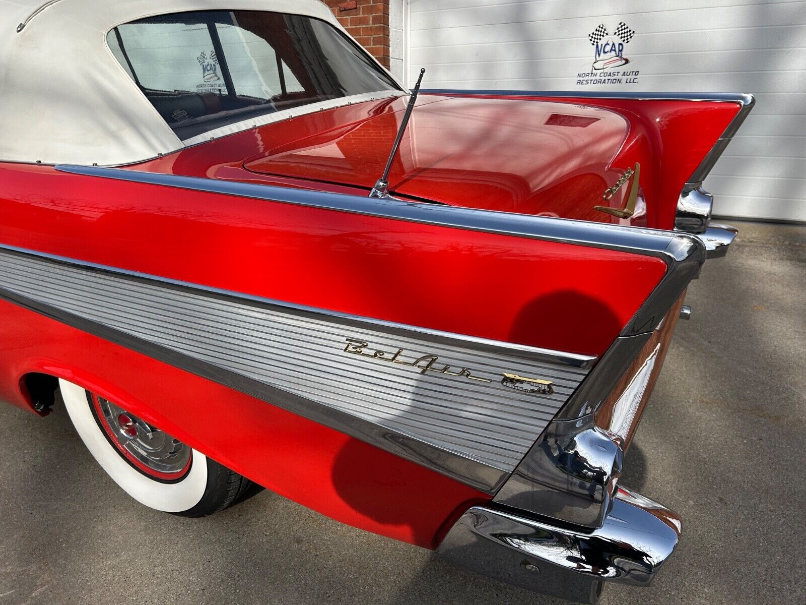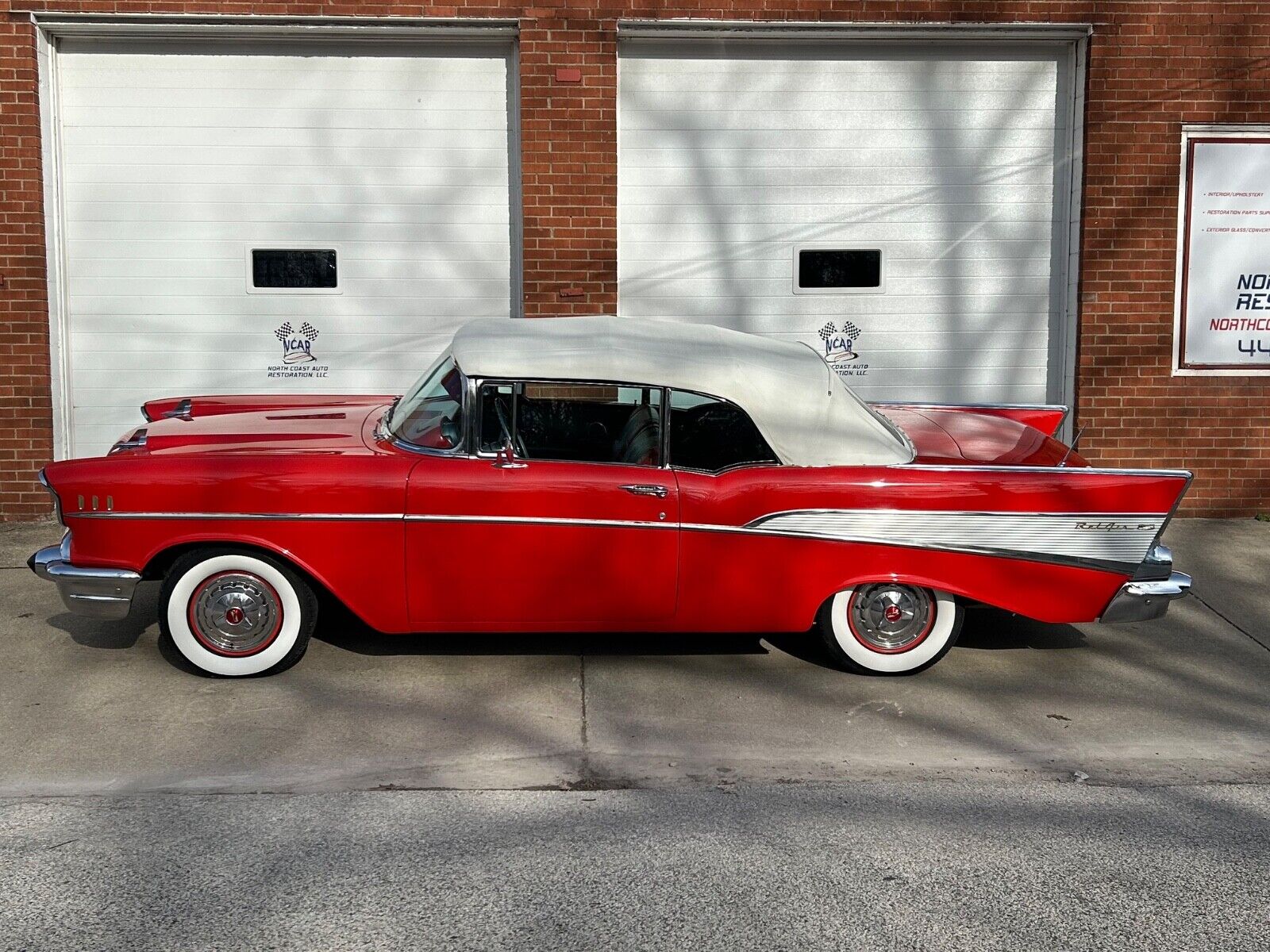 Beautifully restored 1957 Chevrolet Bel Air Convertible finished in Matador Red with a matching red/gray interior. This numbers-matching car features a 283 V8 engine, Powerglide automatic transmission, four-barrel carburetor, and dual exhaust. Show-quality restoration completed in 1989 and carefully maintained in the same family, with only 4,000 miles driven since.