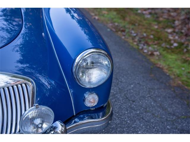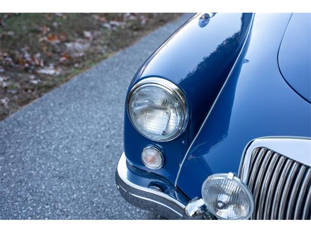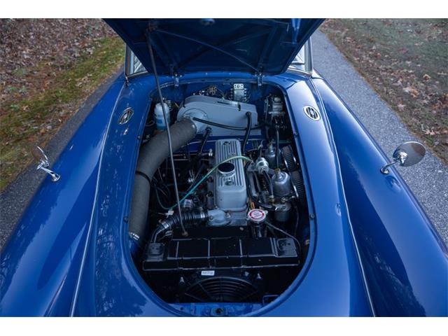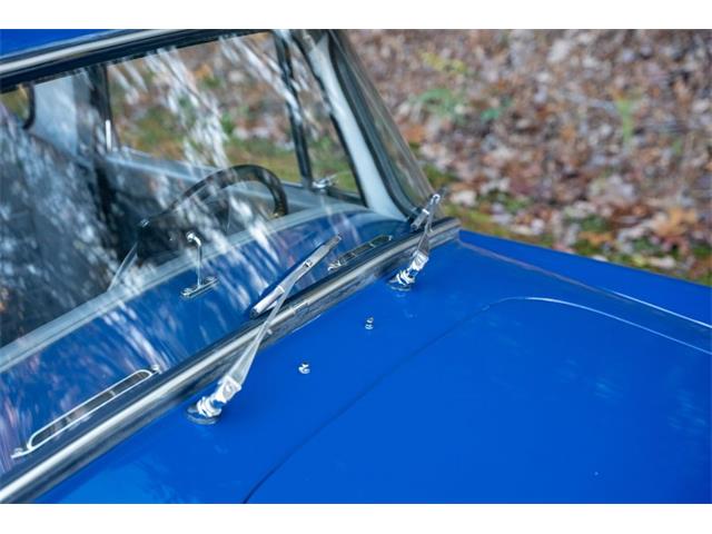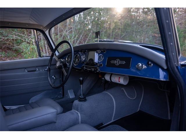 The car is finished in Mineral Blue over a gray leather interior and powered by a 1.5L inline-four cylinder linked with a four-speed manual transmission. Equipment includes 15? wire wheels, driving lights, fender-mounted mirrors, a rear luggage rack, a Smiths heater, a Mallory ignition coil, a Crane Cams electronic ignition module, an electric auxiliary fan, and an oil cooler. Exterior details include a rear luggage rack, fender-mounted mirrors, driving lights, and chrome bumpers with overriders. Chrome 15? wire wheels are mounted with two-ear knock-off spinners and wear 195/65 Goodyear Eagle GT tires. Stopping power is provided by four-wheel drum brakes. The cabin features bucket seats upholstered in gray leather as well as a color-coordinated dash topper, door panels, and carpets. A radio blanking plate adorns the body-color dash, and equipment includes a Smiths heater, a center arm rest, and a fire extinguisher. The banjo-style steering wheel fronts a Jaeger 120-mph speedometer and tachometer as well as a Smiths combination gauge indicating oil pressure and water temperature. The five-digit odometer shows 10689 miles at this time and total mileage is unknown due to it being a 5-digit mechanical odometer. The 1.5L inline-four cylinder is equipped with a Mallory ignition coil, a Crane Cams XR700 electronic ignition module, an electric auxiliary pusher fan, and an oil cooler.