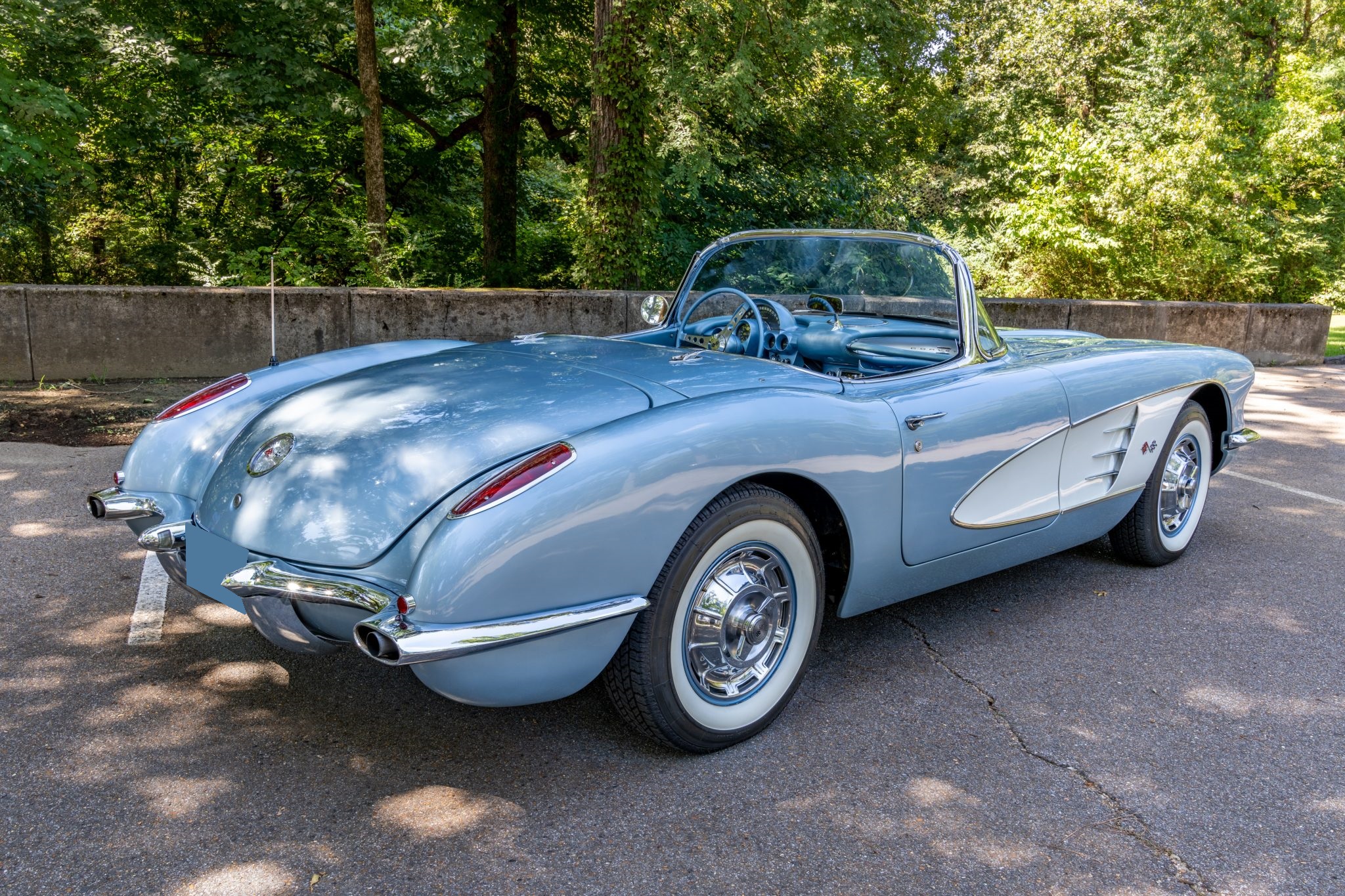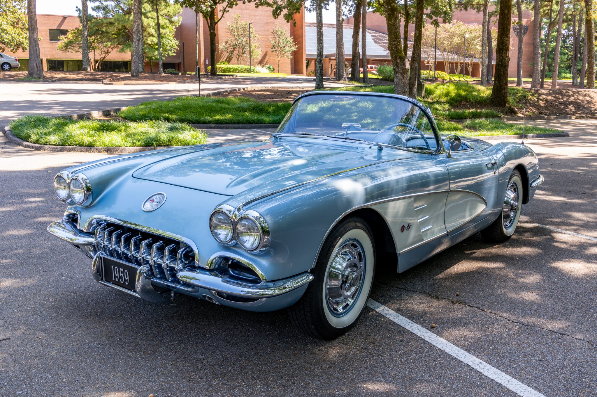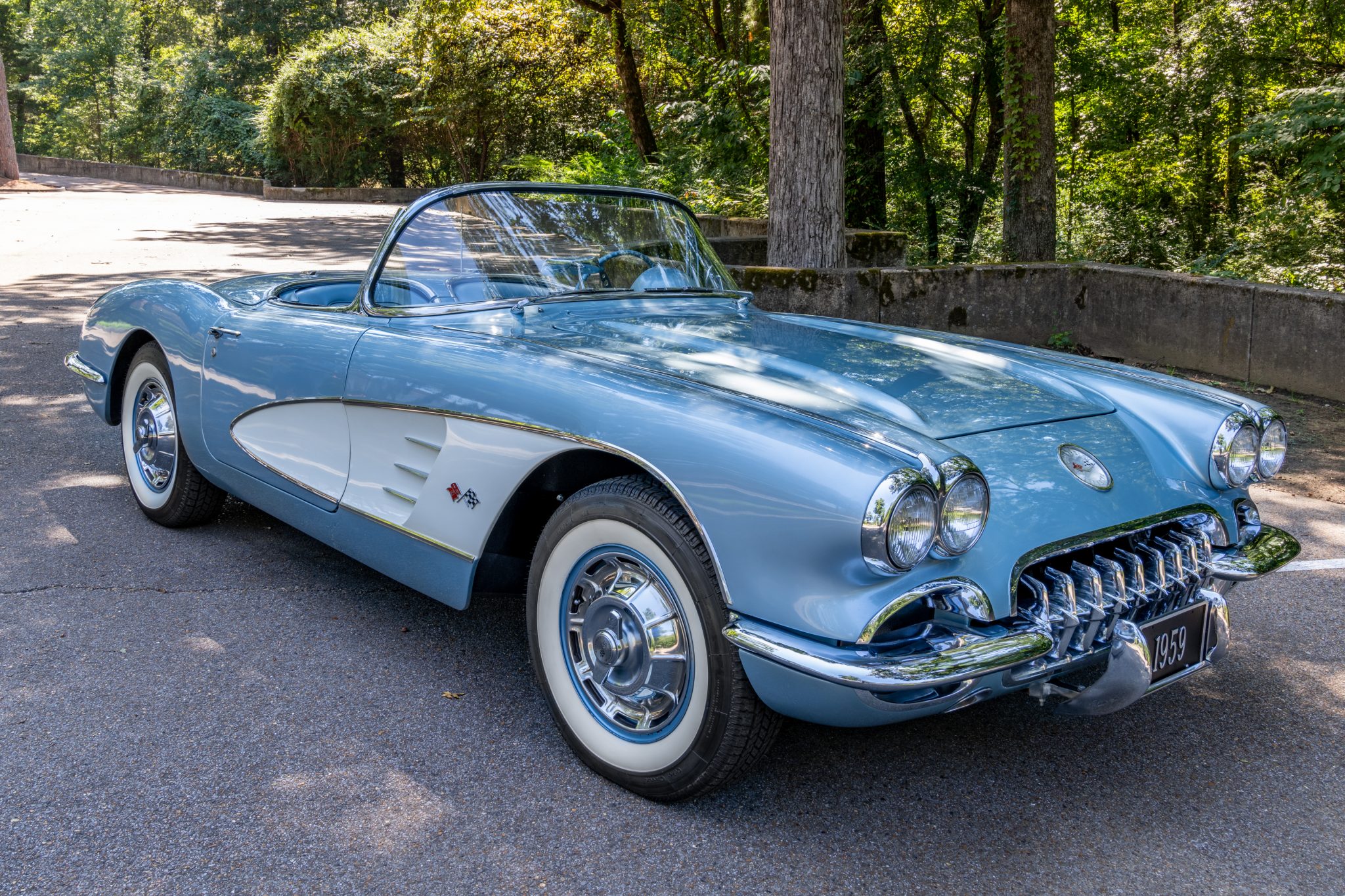 This 1959 Chevrolet Corvette is powered by a 350ci V8 paired with a four-speed manual transmission and is finished in Frost Blue over a blue vinyl interior. Equipment includes a white convertible top, chrome bumpers and trim, power steering, power brakes, 15″ wheels with whitewall tires, a retro-style Bluetooth stereo, and a fire extinguisher.