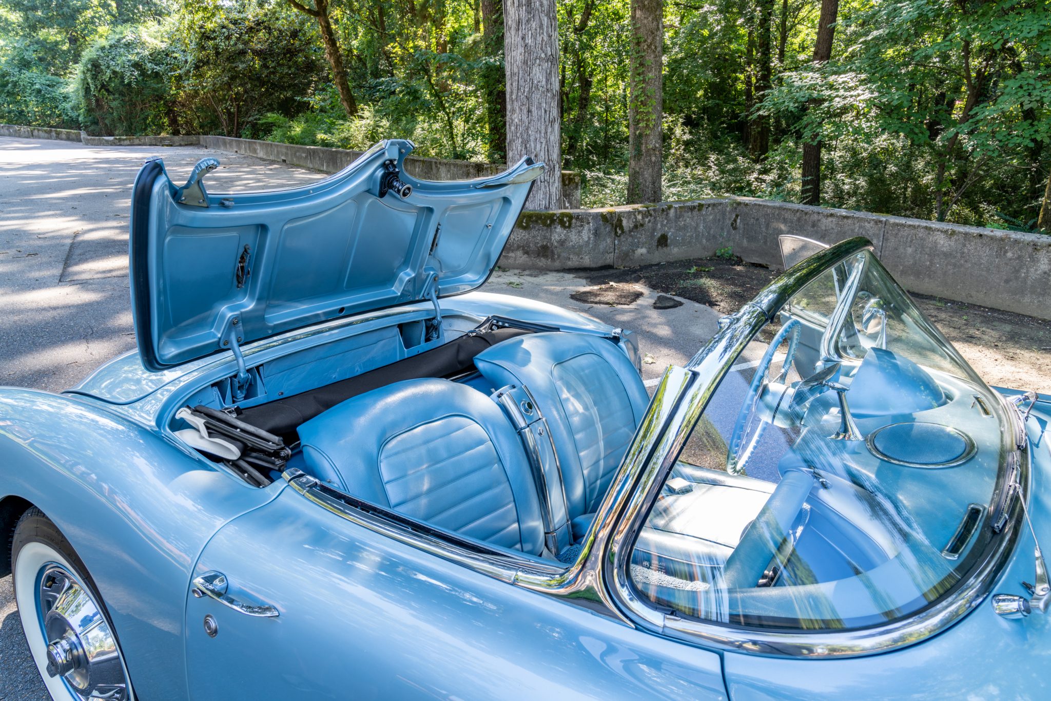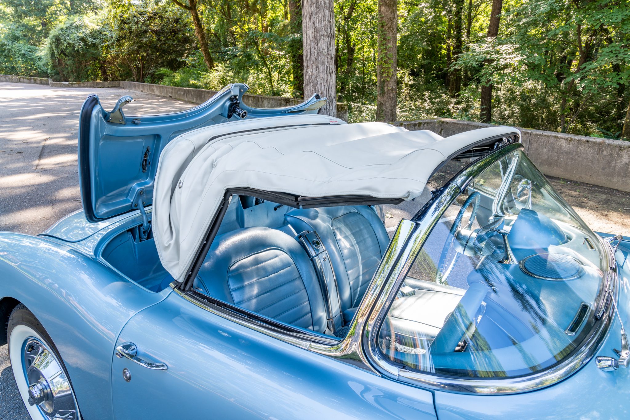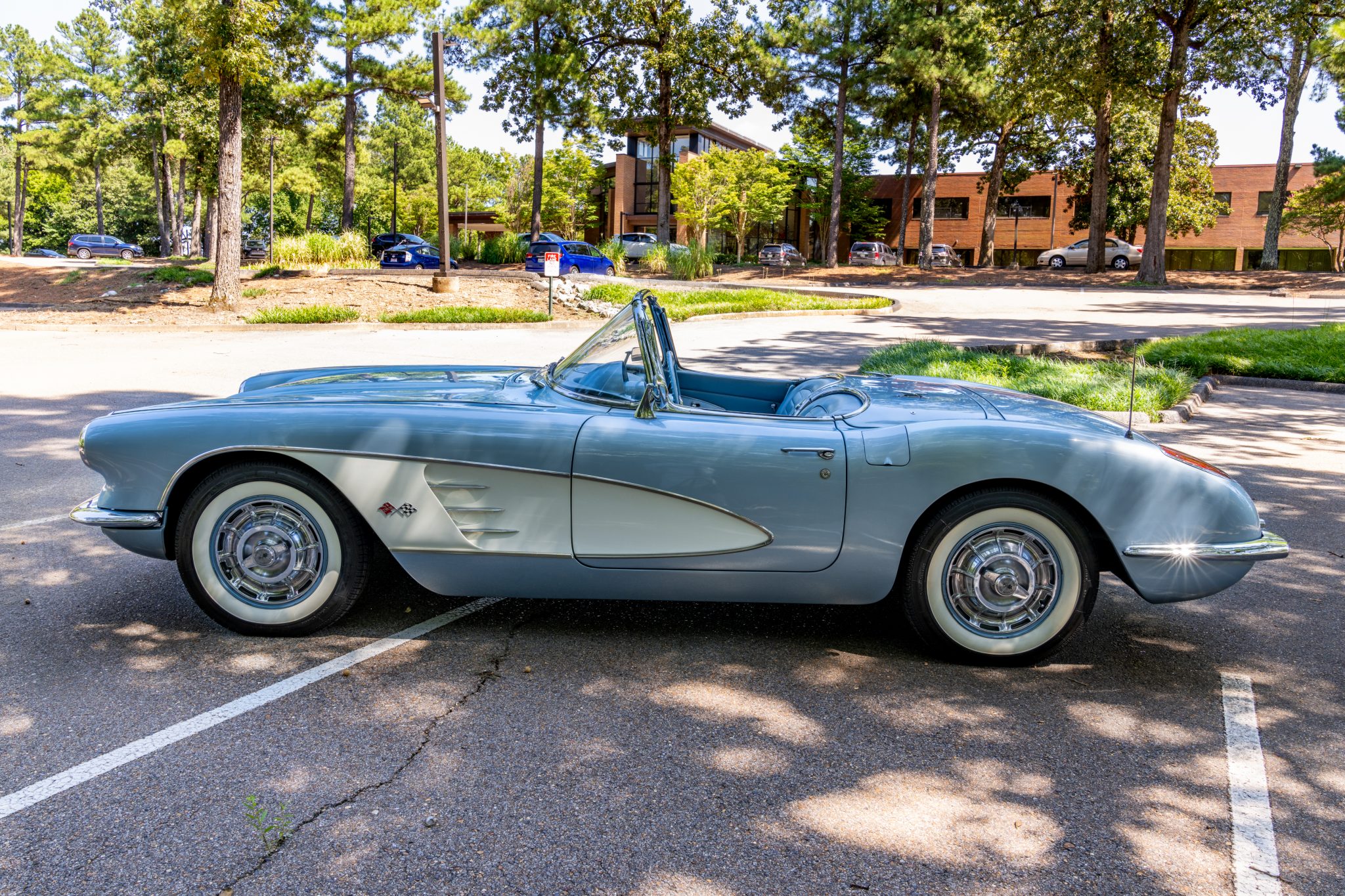 This 1959 Chevrolet Corvette is powered by a 350ci V8 paired with a four-speed manual transmission and is finished in Frost Blue over a blue vinyl interior. Equipment includes a white convertible top, chrome bumpers and trim, power steering, power brakes, 15″ wheels with whitewall tires, a retro-style Bluetooth stereo, and a fire extinguisher.
