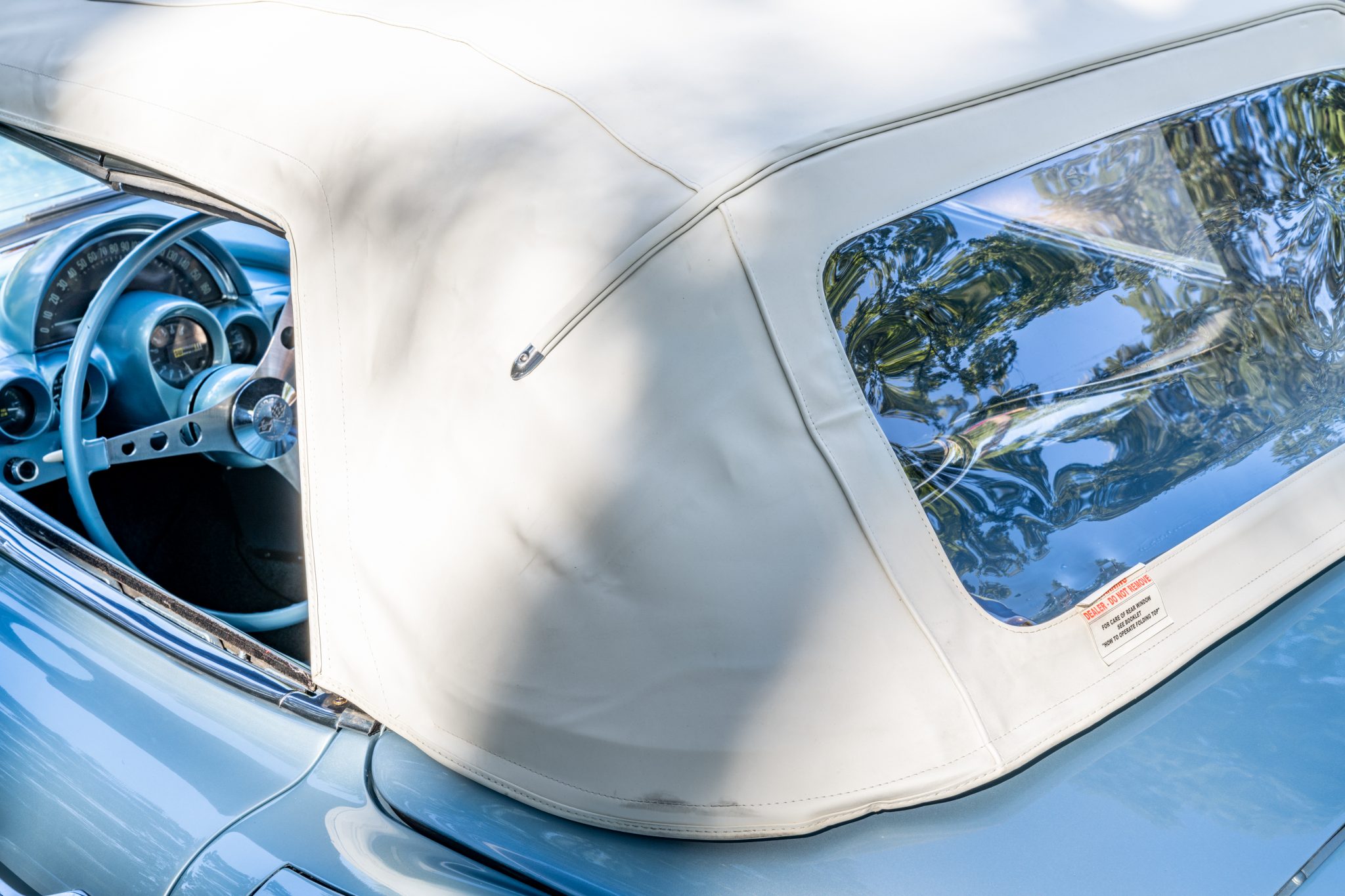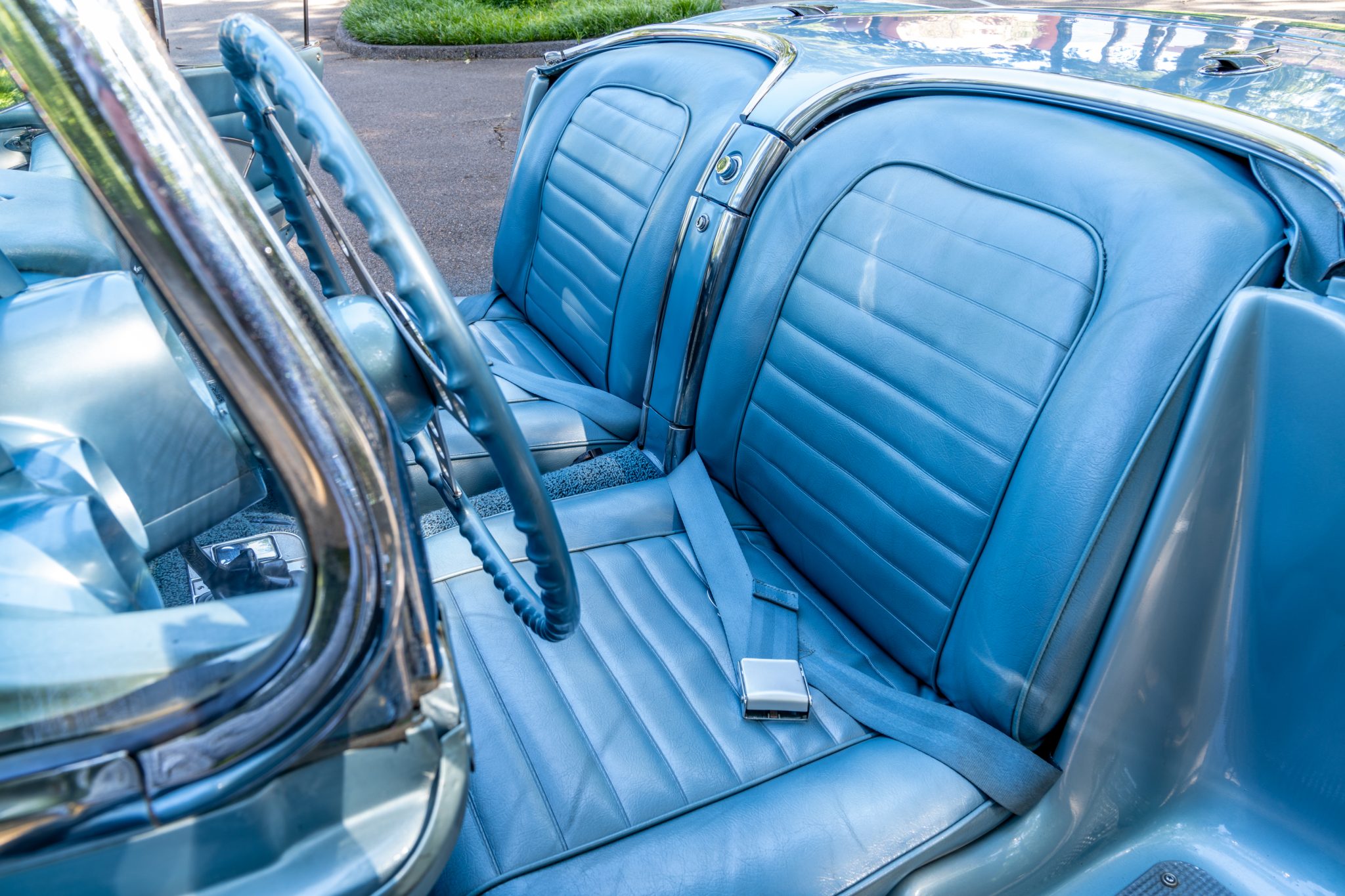 The fiberglass body is finished in Frost Blue and features a replacement white convertible top and matching coves. Additional exterior equipment includes quad headlights, chrome bumpers and trim, and dual exhaust tips exiting through the rear bumper.