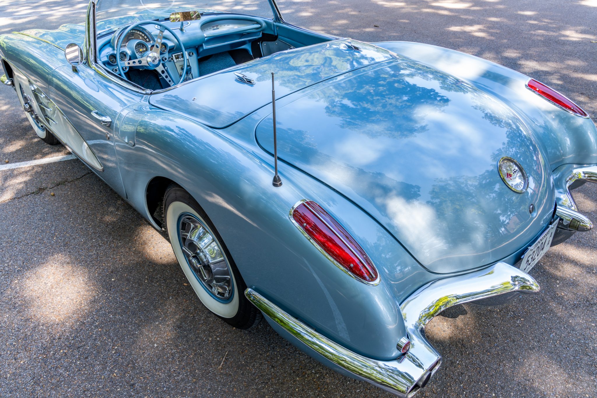 Body-color 15″ wheels feature polished Corvette covers and wear 205/75 Coker Classic whitewall tires. EPAS Performance power steering and power front disc brakes .