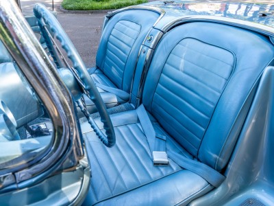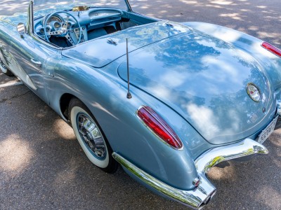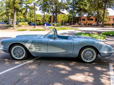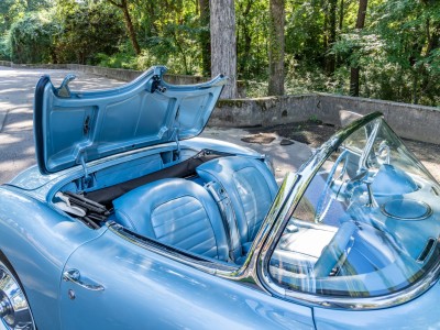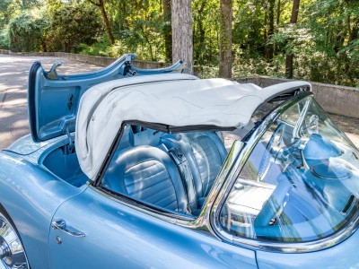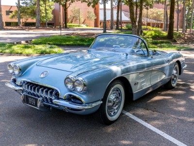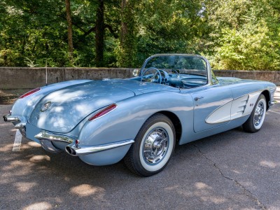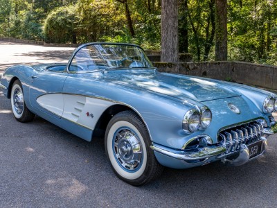 This 1959 Chevrolet Corvette is powered by a 350ci V8 paired with a four-speed manual transmission and is finished in Frost Blue over a blue vinyl interior. Equipment includes a white convertible top, chrome bumpers and trim, power steering, power brakes, 15″ wheels with whitewall tires, a retro-style Bluetooth stereo, and a fire extinguisher.