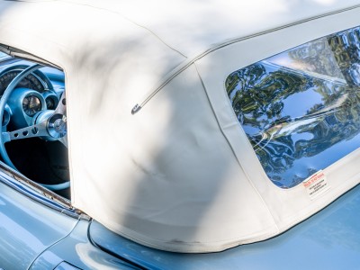 The fiberglass body is finished in Frost Blue and features a replacement white convertible top and matching coves. Additional exterior equipment includes quad headlights, chrome bumpers and trim, and dual exhaust tips exiting through the rear bumper.