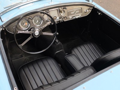 In its factory correct Iris blue paint, bright chrome, and beautiful sweeping lines this MGA has a stunning presence. You could easily show it with great pride at your local weekend car show. The basecoat/clearcoat paint on this car is lustrous and beautiful. During restoration, the body was professionally disassembled, stripped and properly painted. While looking down the side of the car, it’s evident the body is solid and laser straight. Because the car was driven and enjoyed, there are a few very minor rock chips which have been touched-up; none which are large in size and there are no visible chips, dings, dents, etc. It really does look as great as it does in pictures. The body gaps are even and lined up with precision on this car. The glass is in very good shape as are the rubber seals and chrome trim surrounds. The bumpers are in excellent condition along with the chrome trim and emblems.