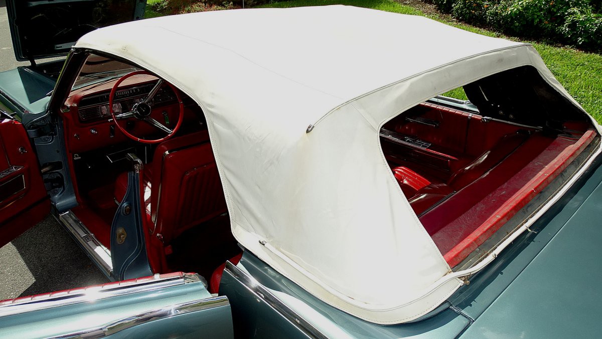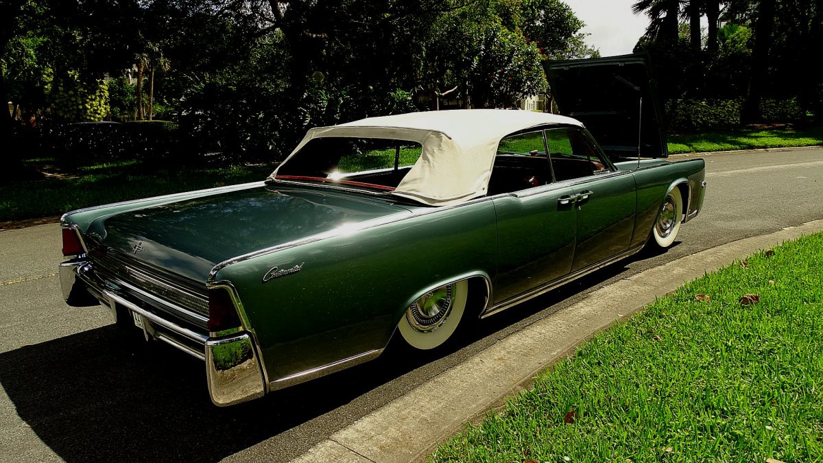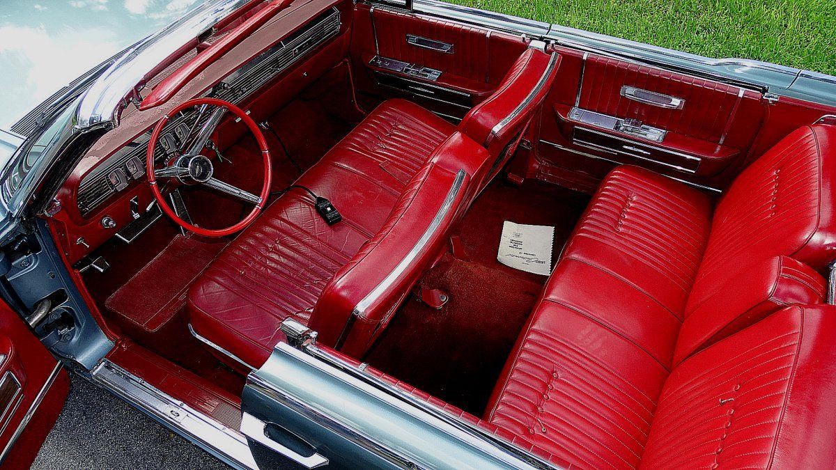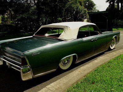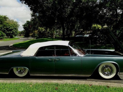 1964 LINCOLN CONTINENTAL CONVERTIBLE WITH THOSE CLASSIC SUICIDE DOORS AND COMES IN A VERY DESIRABLE COLOR COMBINATION OF PRINCETON GREY POLY EXTERIOR AND A RED LEATHER INTERIOR. CAR HAS ORIGINAL BODY AND INTERIOR AND ALL THE POWER ACCESSORIES WORK FINE. HAS POWER WINDOWS, TOP, DRIVERS SEAT, RADIO, WIPERS COURTESY LIGHTS, AND POWER LOCKS. RUNS WELL AND SHIFTS PERFECTLY. COMES WITH A COMPLETE AIR RIDE SYSTEM. HAS A NEW SET OF GANGSTER WIDE WHITE WALLS. NEEDS A PLASTIC BACK WINDOW WHICH IS THERE JUST CLOUDY. THE TOP ITSELF IS IN GREAT SHAPE. THE POWER STEERING HAS A SLIGHT GROWN AND THE BRAKES ARE A BIT HARD BUT VERY DRIVABLE. THESE CARS ARE REALLY GOING UP IN VALUE AND ARE BECOMING VERY HARD TO FIND A DECENT ONE LIKE THIS ONE. THIS IS ABOVE AVERAGE IN MY BOOK AND RUNS WELL. YOU CAN GO RIGHT TO A CRUISE NIGHT WITH IT AND WITH A LITTLE LIGHT TLC COULD MAKE IT INTO A REALLY GREAT RIDE AND IS ALL READY AN EYE CATHER.