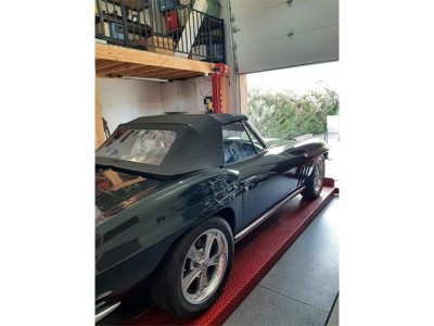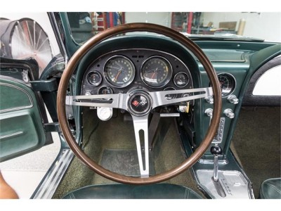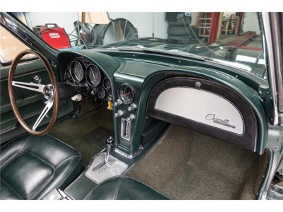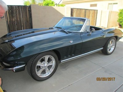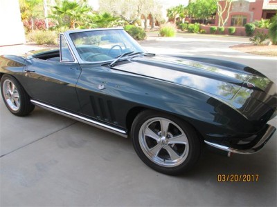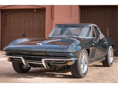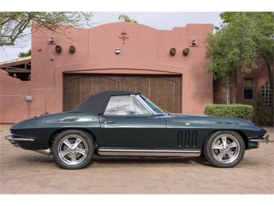 This 1965 Chevrolet Corvette It is powered by a rebuilt 327ci V8 engine backed by a TH350 three-speed automatic transmission. Features include power brakes, power steering, an AM/FM radio, and a wood-rim steering wheel. Finished in Glen Green and equipped with a black manual convertible top over a dark green vinyl interior, this C2 Corvette is available now and comes with the removed original parts detailed below, receipts, and a clear title. The exterior is finished in Glen Green. Features include chrome bumpers, hide-away headlights, front fender vents, rocker panel trim, a driver-side mirror, a manual black vinyl folding convertible top, a rear antenna, and a flip-up fuel filler cap. A set of five-spoke aluminum Coys wheels is wrapped in radial tires. The bucket seats and trim are upholstered in dark green vinyl. Features include power steering, power brakes, a center console with an automatic shifter, manual windows, an AM/FM radio, and a three-spoke steering wheel with a wood rim. A 160-mph speedometer, a 7K-rpm tachometer, a clock, and gauges for the fuel level, coolant temperature, oil pressure, and amps are located ahead of the driver. The odometer reads 98,000 miles, but the true mileage on this vehicle is unknown. Power is provided by a rebuilt 327ci V8 engine equipped with a newer camshaft and backed by a TH350 three-speed automatic transmission. Engine bay features include finned polished aluminum valve covers, a newer aluminum intake manifold, a newer carburetor, a chrome Edelbrock air cleaner, a newer HEI distributor, tube exhaust headers, and an aluminum radiator. This Corvette was factory-equipped with a four-wheel independent suspension and a rear drive axle. According to the seller, the chassis was rebuilt with NOS (new old stock) parts. Braking is provided by power four-wheel discs. A full-length dual exhaust system exits at the rear. The seller will include receipts and the following removed original parts with the purchase of the car: Reportedly numbers-matching Powerglide two-speed automatic transmission Heads Intake Exhaust manifolds Breather Carburetor Wheels and hub caps Brake calipers Radiator