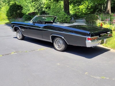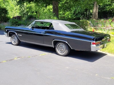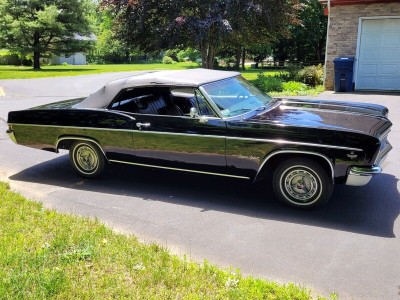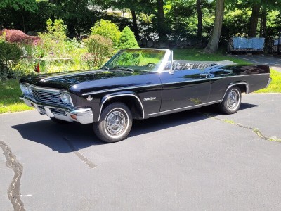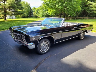 Beautiful, highly original triple black Impala SS Convertible. Originally a 327/275 HP car, now powered by a rebuilt GM Goodwrench 350 4-bolt main engine (less than 1,000 miles) paired with a Turbo 400 3-speed automatic. Original 10-bolt rear with 3.36 gears. Features include original bucket seat interior with console and factory gauges, power steering, power top, and power drum brakes (all new components). Rides on new whitewall radial tires with original SS hubcaps. Excellent chrome and glass; older repaint still shows well. Runs strong and drives beautifully an outstanding example of a rare, triple black 1966 Impala SS Convertible.