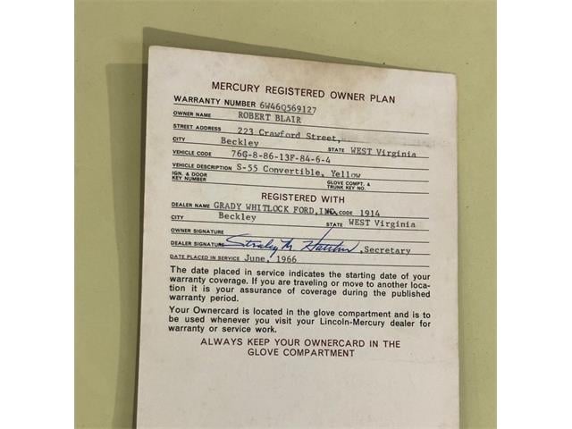 1 of 669 Mercury S55 convertibles produced in 1966. This car was delivered new to district sales office (DSO) "84" which reflects Ford Motor Company home office and may explain why its equipped with nearly every factory option available. This is an unrestored car with original interior and still retains much of its original paint. Its powered by its original "Q" code 428 cubic inch V8 engine factory rated @ 345 horsepower. Previously in the Tom Gerrard Collection. A remarkable highly original and rare S55 convertible.