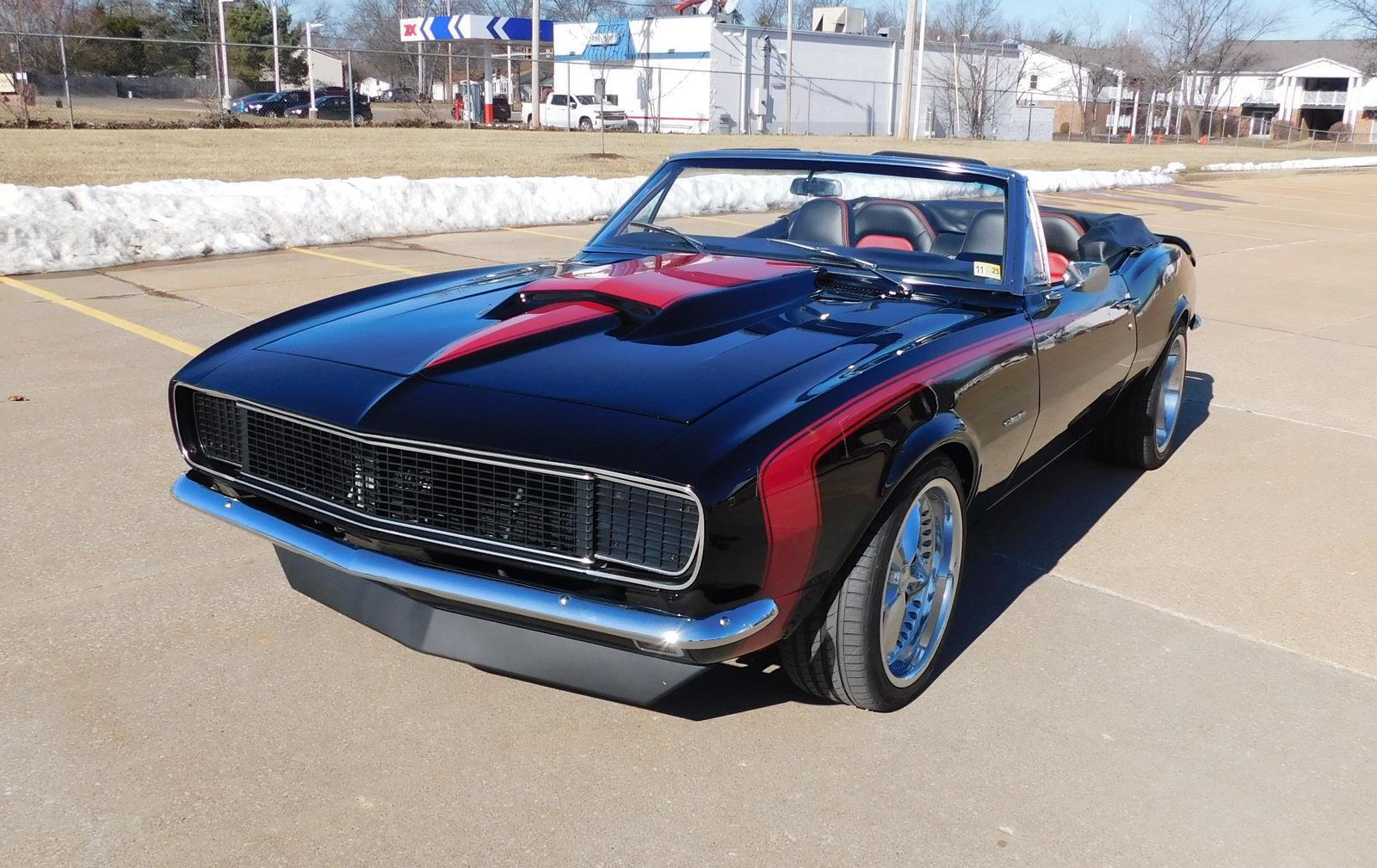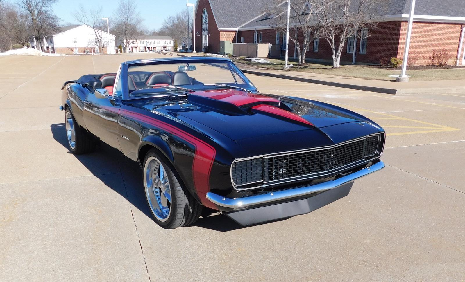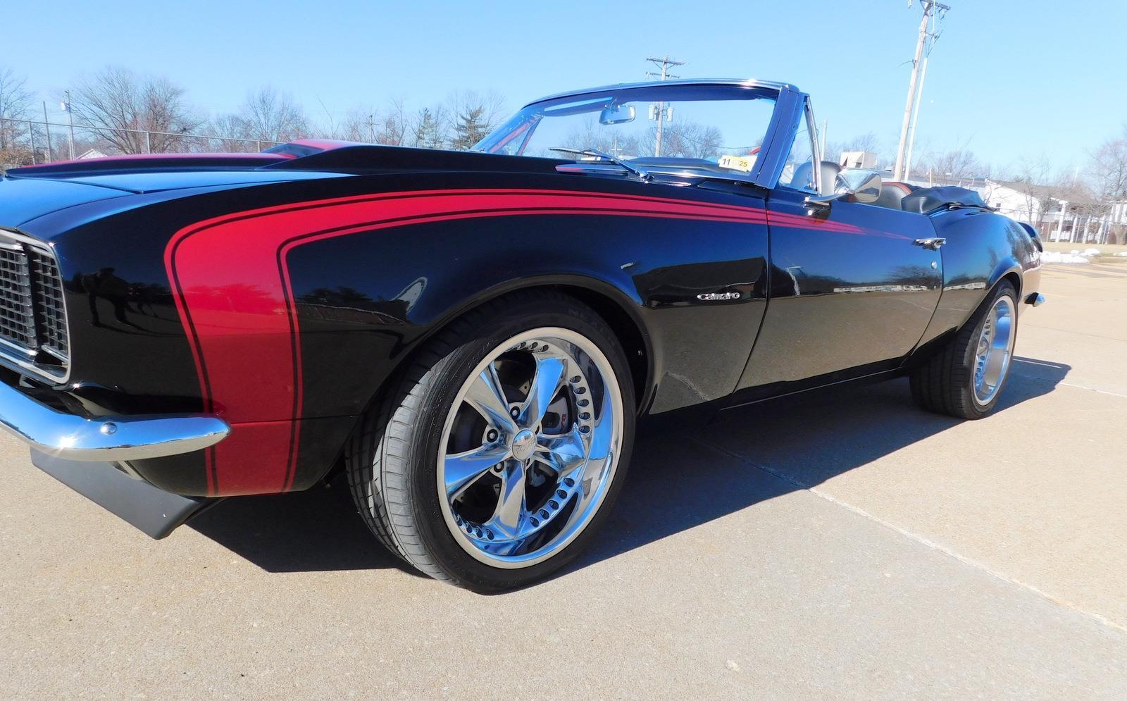 For sale: 1967 Chevrolet Camaro Convertible – A stunning fusion of classic style and modern performance. Powered by a 430 HP LS3 V8 engine and Tremec 5-speed manual transmission, this car delivers impressive acceleration and top speed. The upgraded suspension features Detroit Speed Quadralink and coil-over shocks for a smooth ride, while Baer big brakes ensure confident stopping power. The sleek black exterior with a red hockey stick stripe, Corvette-style stinger hood, and custom Rally Sport hideaway headlights make this Camaro a showstopper. Inside, enjoy a matching black and red interior with four bucket seats, custom center console, and a premium sound system. Finished with 18-inch Foose wheels and Nexen low-profile tires, this Camaro is a true masterpiece in both style and performance.