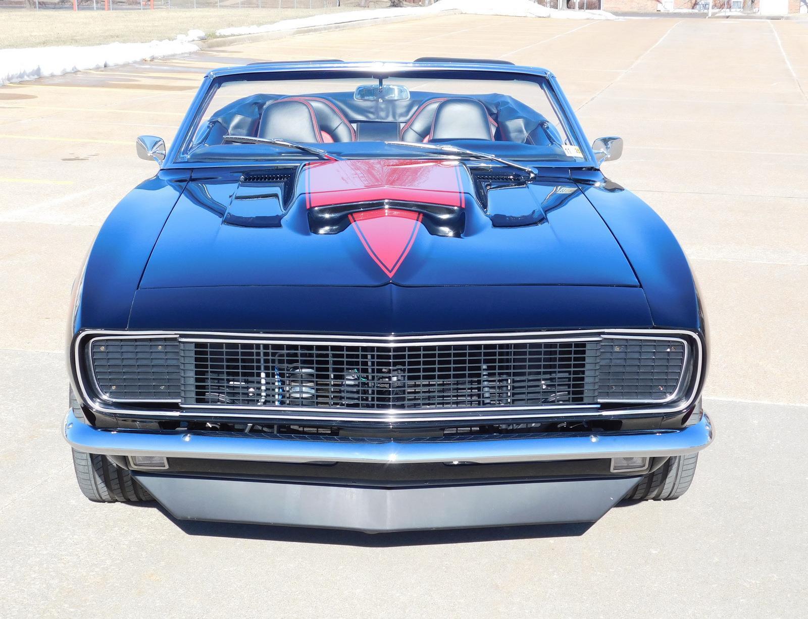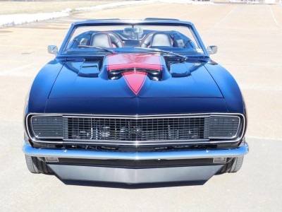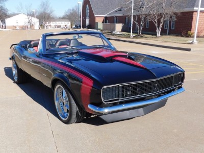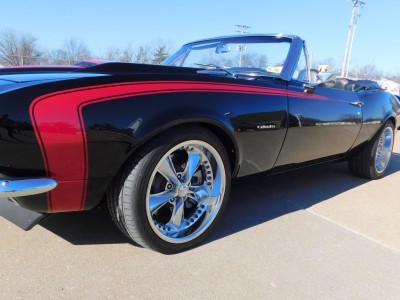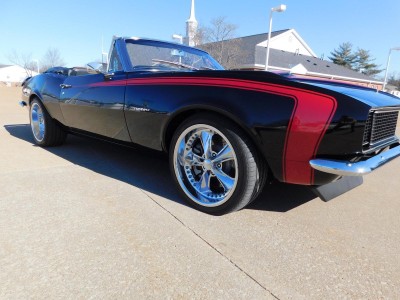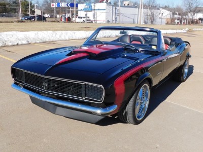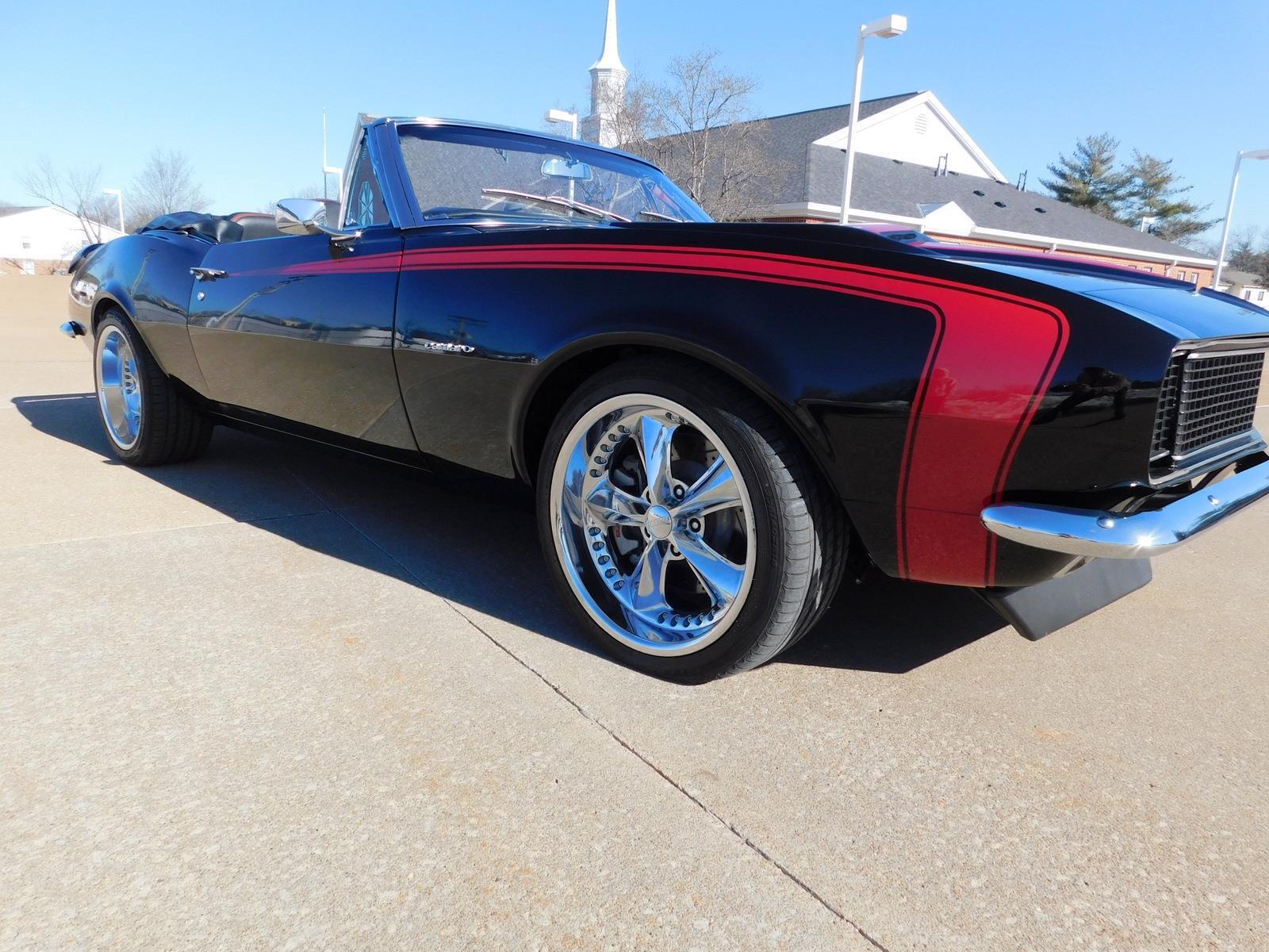 For sale: 1967 Chevrolet Camaro Convertible – A stunning fusion of classic style and modern performance. Powered by a 430 HP LS3 V8 engine and Tremec 5-speed manual transmission, this car delivers impressive acceleration and top speed. The upgraded suspension features Detroit Speed Quadralink and coil-over shocks for a smooth ride, while Baer big brakes ensure confident stopping power. The sleek black exterior with a red hockey stick stripe, Corvette-style stinger hood, and custom Rally Sport hideaway headlights make this Camaro a showstopper. Inside, enjoy a matching black and red interior with four bucket seats, custom center console, and a premium sound system. Finished with 18-inch Foose wheels and Nexen low-profile tires, this Camaro is a true masterpiece in both style and performance.