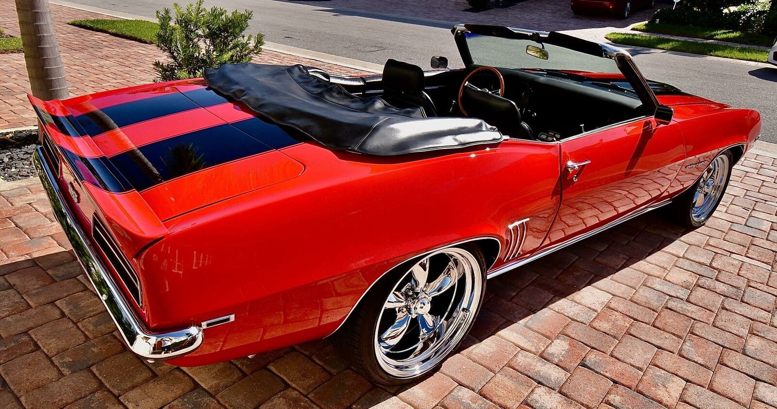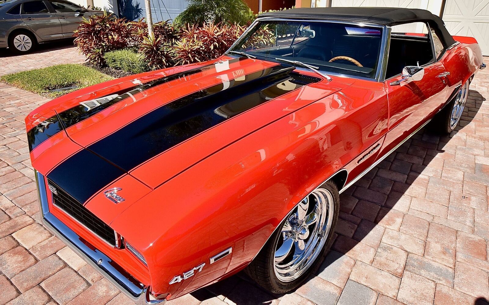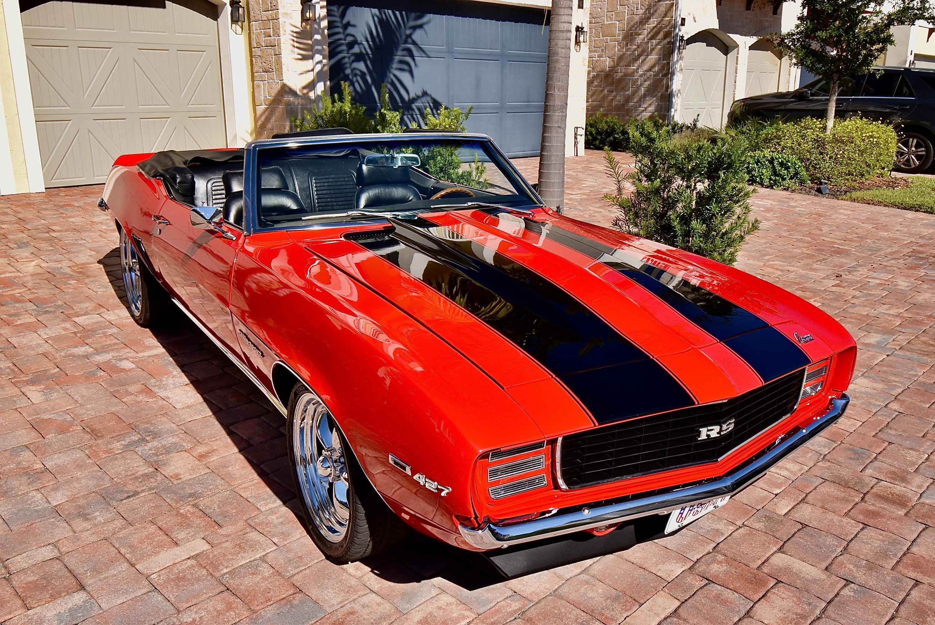 1969 Chevrolet Camaro RS Convertible. Immaculate Red paint with Stripes under the clear. Interior is in very good condition. Powered by a 454/V8 4 bolt main serpentine belt motor, aluminum intake, electric fans, 4 speed manual, Hurst shifter, hideaway headlights, bucket seats, console with gauges, power steering, power brakes, power top and black top boot. New wood rim steering wheel, new American Racing wheels. Tachometer will be added in the clock position. This a stunning car in person and pictures.