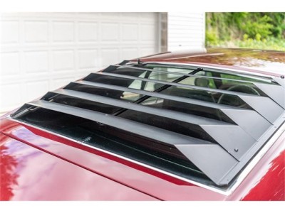Originally finished in Wimbledon White with a blacked-out hood (color codes M and 5), the exterior was repainted Toreador Red in 1989. Features include chrome bumpers, hood blackout, hood pins, a hood scoop, an aftermarket hood-mounted tachometer, a black front spoiler, color-keyed sport mirror caps, rocker trim, and rear window louvers.