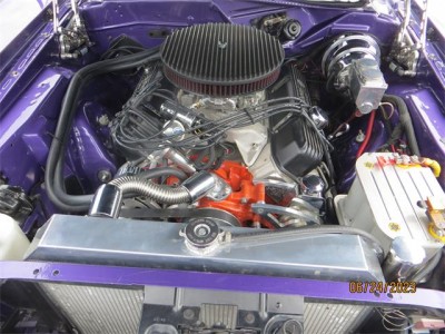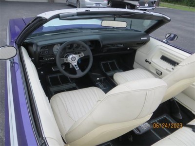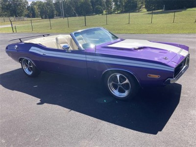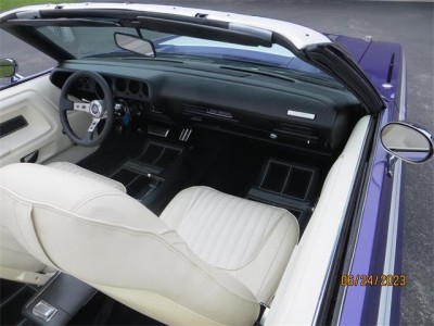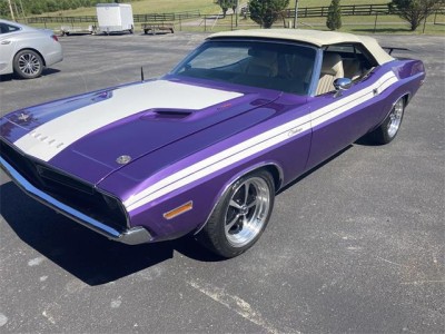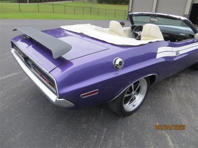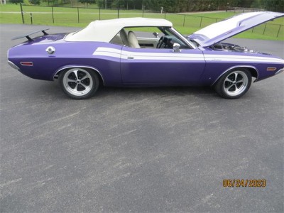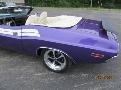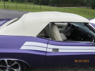 1971 Dodge Challenger Convertible with a rebuilt Mopar RB 383 engine, not original to the car, with a Edelbrock E-street aluminum top end ( heads and intake manifold), Edelbrock AVS2 1906 carburetor and a mild Iskendarian 994 purple cam with hydraulic lifters. It has CVF Serpentine front drive, aluminum pulleys, magnetic distributor, Hooker long tube headers, Thermostat controller electric fans, new Dakota Digital dash all with less than 500 miles since engine rebuild. It has a 3 speed Mopar 727 transmission with a deep oil pan. Limited number of challengers convertibles were produced in 1971. Other upgrades and changes include 4 wheel Baer disc brakes with it's own vacuum pump do to he larger cam, Hotchkis upper and lower "A" arms and torsion bars, Viking two way adjustable shocks, Saginaw recirculating ball steer gear, tie rod Heim joints, Ring Brother hood hinges, hallo parking lights.