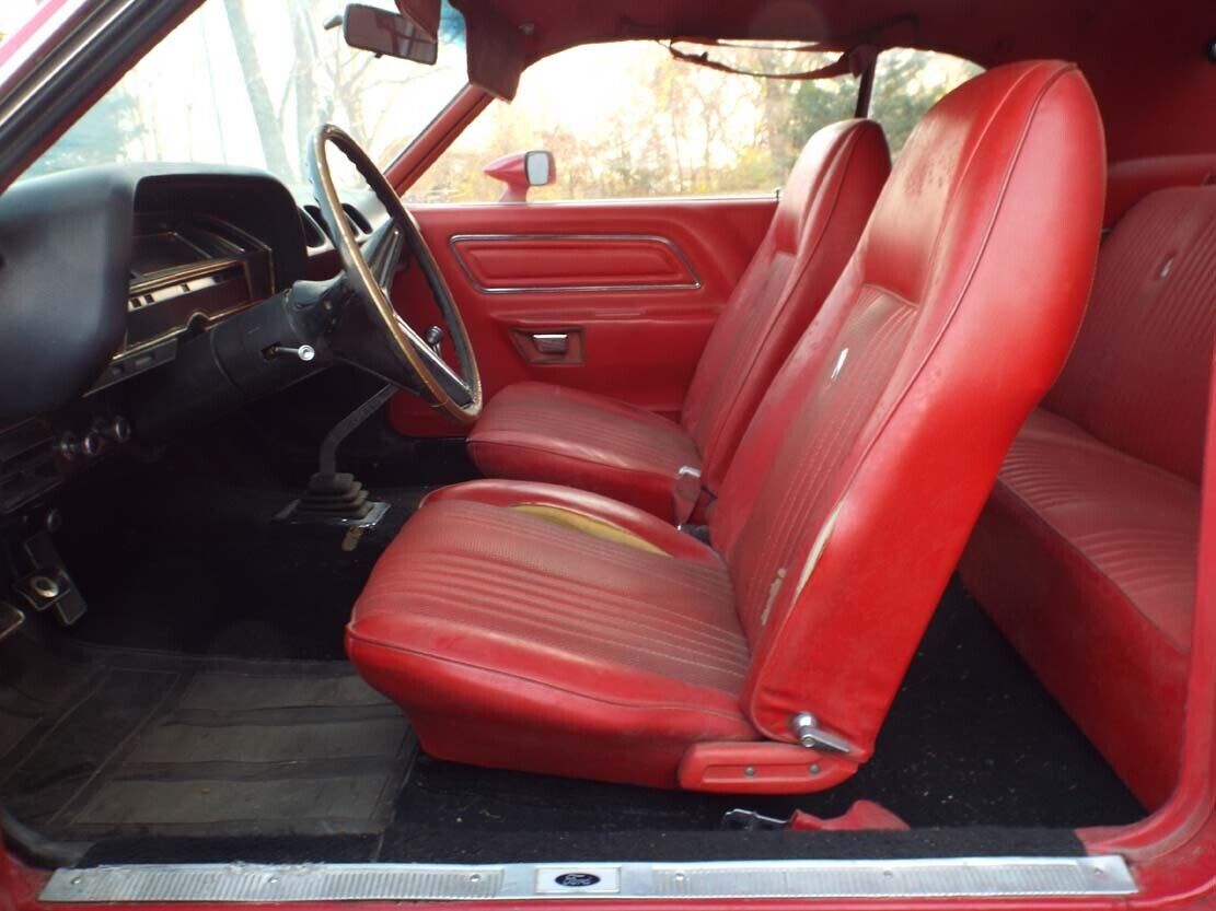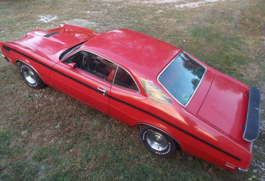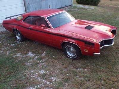 1971 Mercury Cyclone Spoiler Red with Vermilion hi back bucket seat interior.Black Spoiler side stripes.351 four barrel engineFour Speed top loader manual transmission with Hurst ShifterPower SteeringPower Disc BrakesRear Window DefrosterDual racing mirrorsFront and rear spoilersPerformance hood with integral scoopRunning lightsTachometer, oil gauge, temperature gauge, ammeter, and 140 mph speedometer.Deluxe rimblow steering wheelThe Cyclonehas a rebuilt replacement 351 Cleveland four barrel engine. The oil pan drain plug hole was found to be stripped when the engine was installed. The engine has never been started because oil pan needs to be replaced.The exhaust flanges are set up for headers. The engine has stock exhaust manifolds. Stock exhaust flangesare included.The Cyclone has not been driven since at least the 1990s, and it has been stored inside.The murals are dated from 1976.The gauge package dash pad is in nice condition. The interior has some cracks and tears.The front spoiler and brackets are in the trunk.The floors and frame rails appear solid.