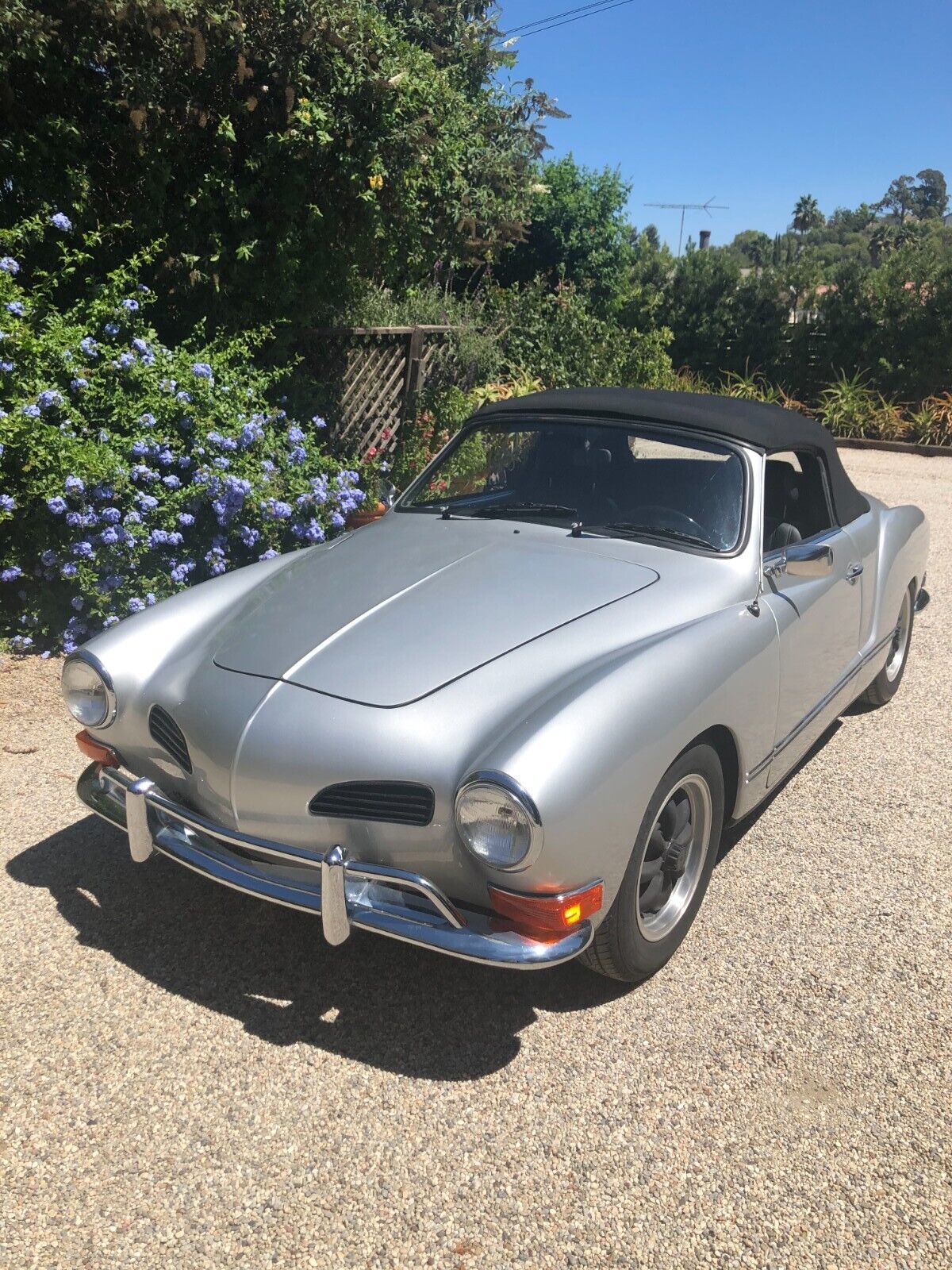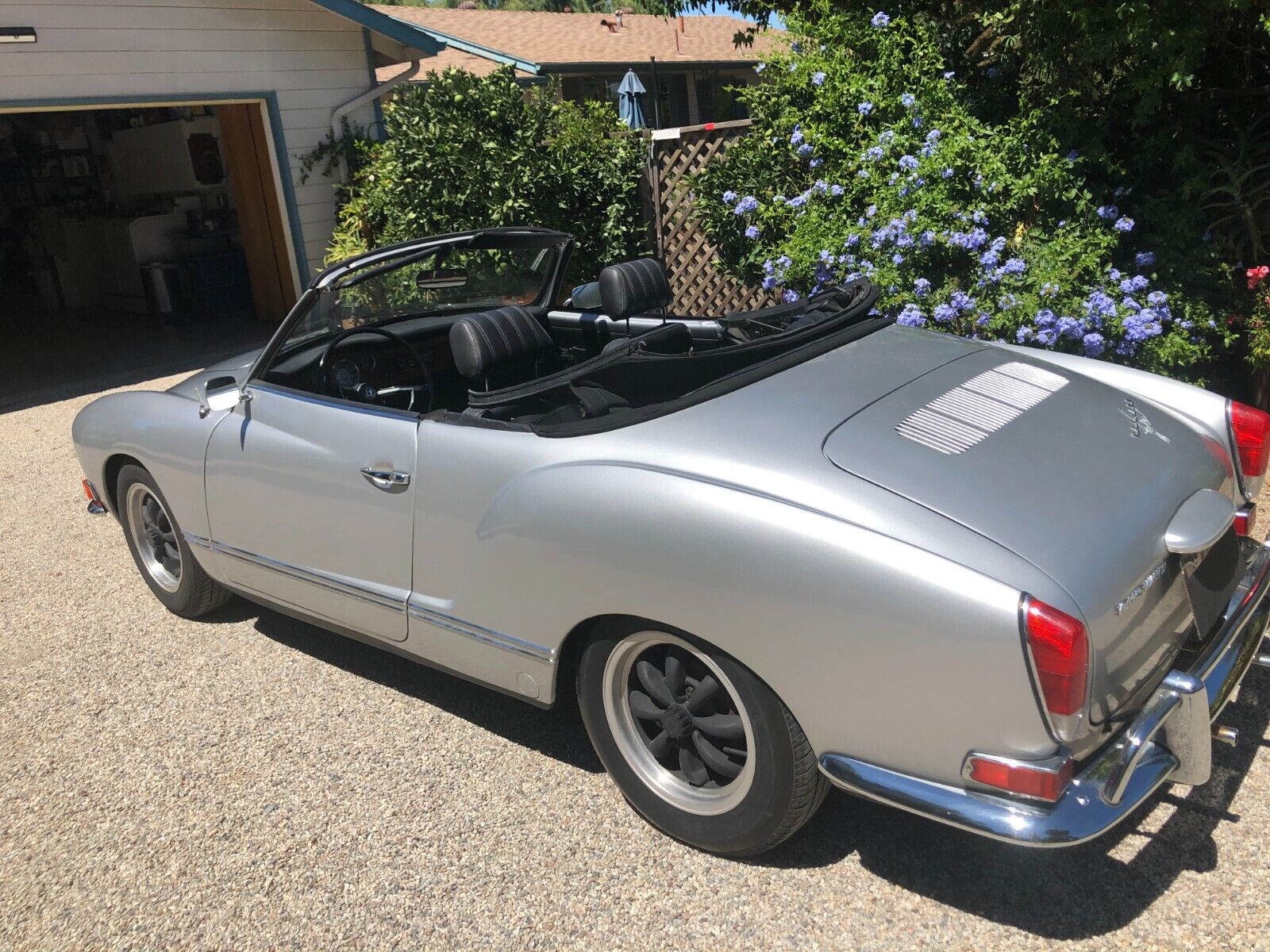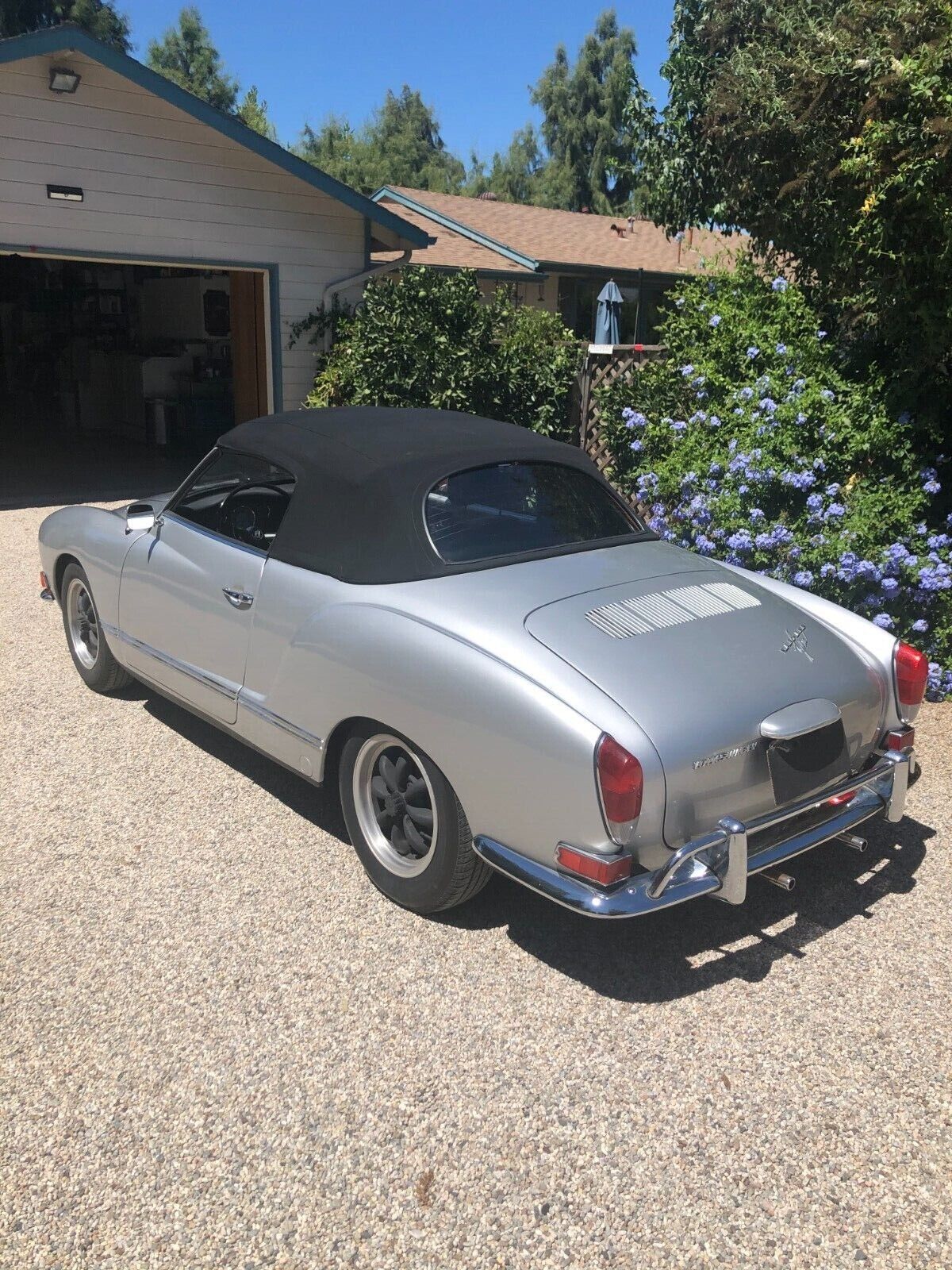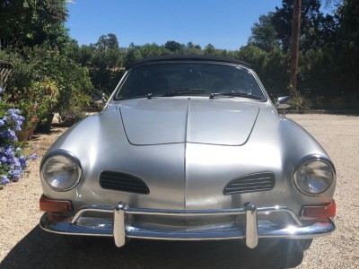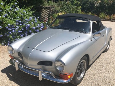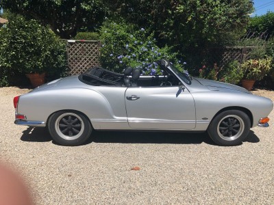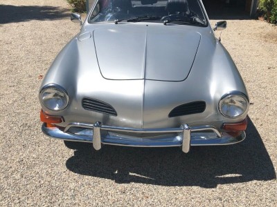 Vintage 1971 Karmann Ghia for Sale. Beautiful Silver Paint Job with custom interior and convertible top. Engine has recently been rebuilt (Bored to 1766cc) and has a Free Flyer 4 speed transaxle installed. Also has twin Weber carburetors, new clutch, rebuilt front end suspension along with sound deadening insulation installed under the carpets and inside side doors. Sports custom mag wheels and heavy duty custom car cover.