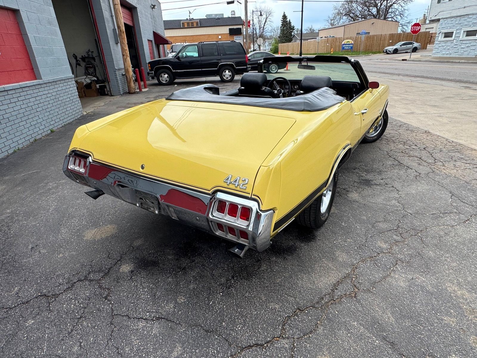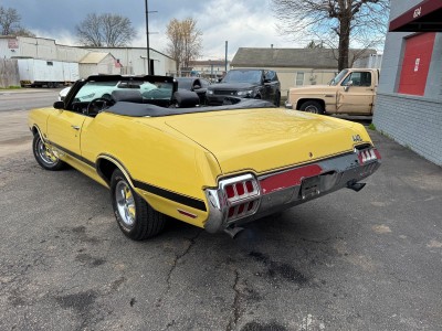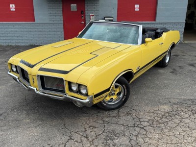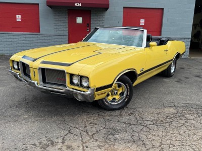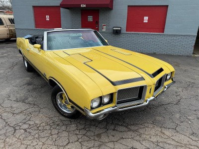 Offered for sale is a beautiful 1972 Oldsmobile Cutlass 442 Convertible finished in bright yellow with a black interior. Powered by a 350 V8 Rocket engine paired with an automatic transmission and rear-wheel drive, this classic delivers both style and performance. The car shows 23,412 miles, features factory air conditioning, power steering, front disc brakes, and a power convertible top. The body is clean and straight, the interior is in excellent condition, and a brand-new convertible top with glass rear window has just been installed. A well-kept, iconic muscle car ready to enjoy.