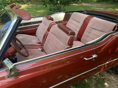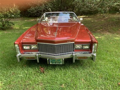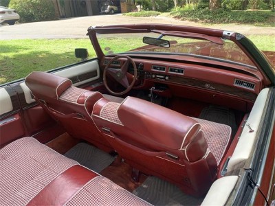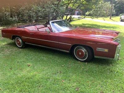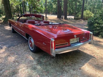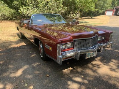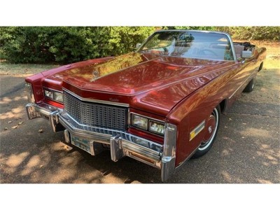 This 1976 Cadillac Eldorado convertible is powered by a 500cid V8 backed by a three-speed automatic transmission. Features include power steering and brakes, power windows and locks, air conditioning, a tilt and telescoping steering column, an AM/FM/8-track stereo, cruise control, and a color-keyed hard parade boot. Several parts, including the top, air conditioning compressor, and front drive axles, have been replaced within the last two years. Finished in Firethorn Metallic and equipped with a matching vinyl convertible top over an Antique Dark Firethorn leather and houndstooth cloth interior, this Eldorado comes with service records and a clear title in the seller's name.