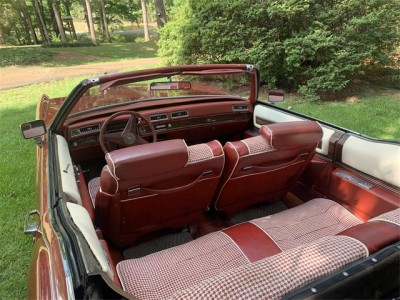 The exterior has been refinished in the original color of Firethorn Metallic (code 36). Features include chrome bumpers, hood trim, a hood ornament, white accent stripes, fender-mounted lighting indicators, side impact moldings, wheel well and rocker moldings, and a covered trunk lock. Between 2022 and this year, the Firethorn vinyl convertible top, two-piece hard parade boot, and low-beam headlights were replaced.