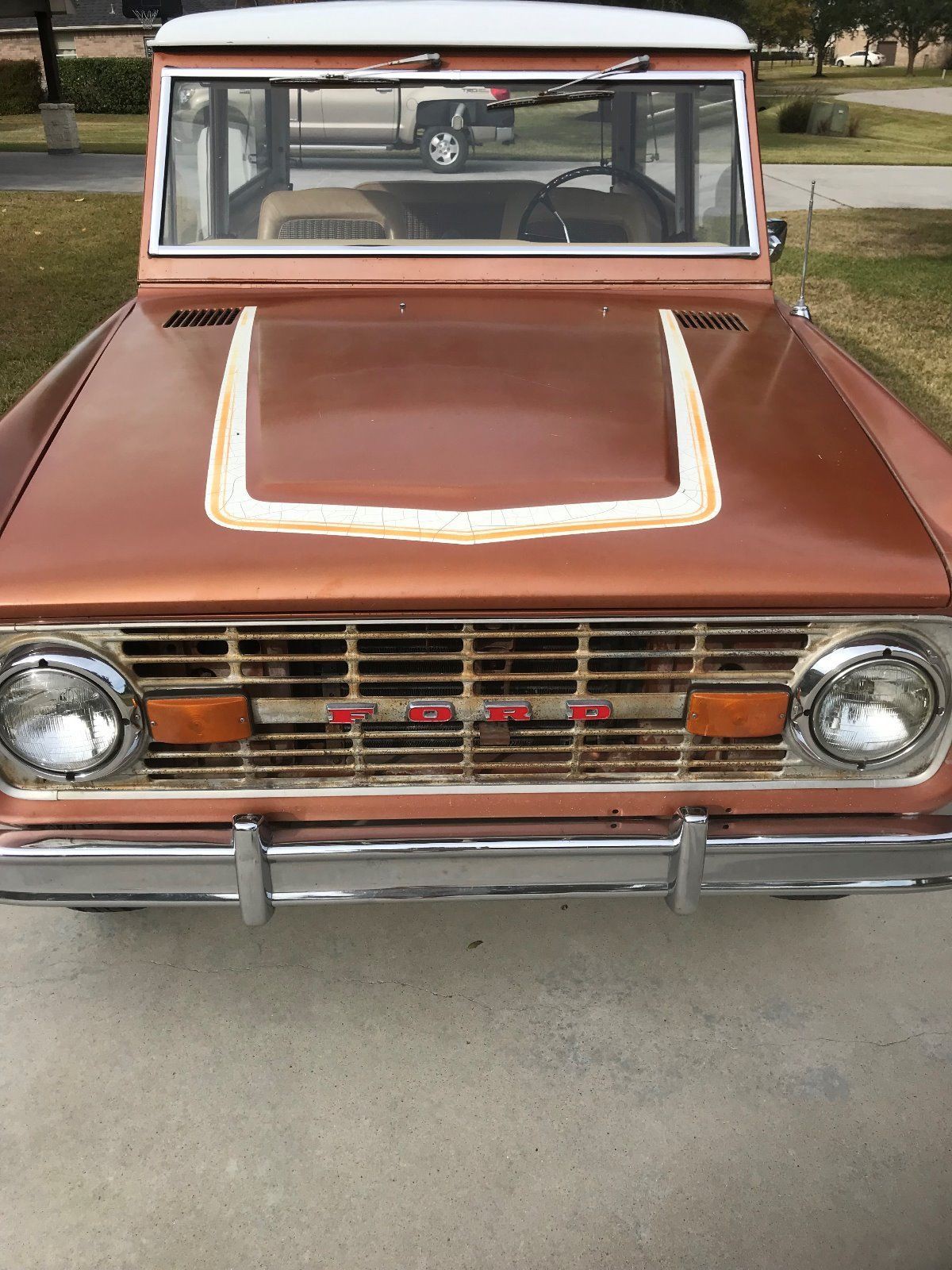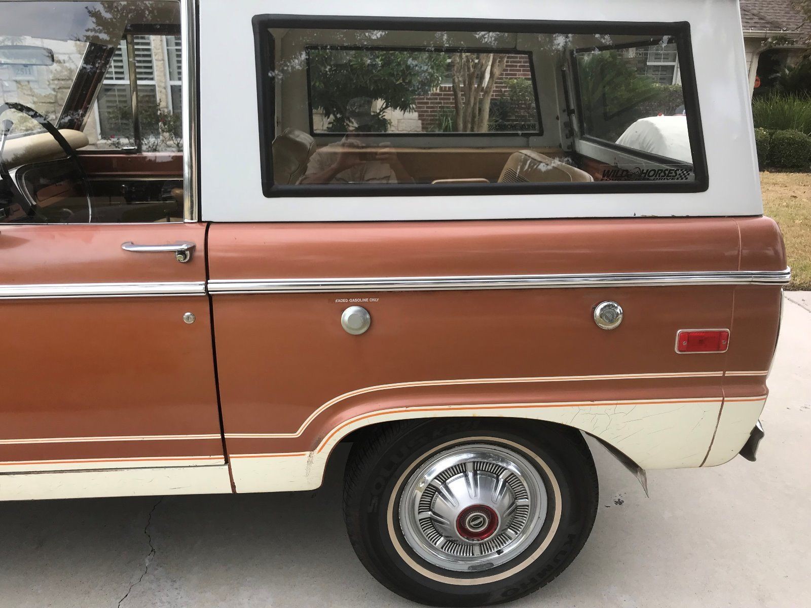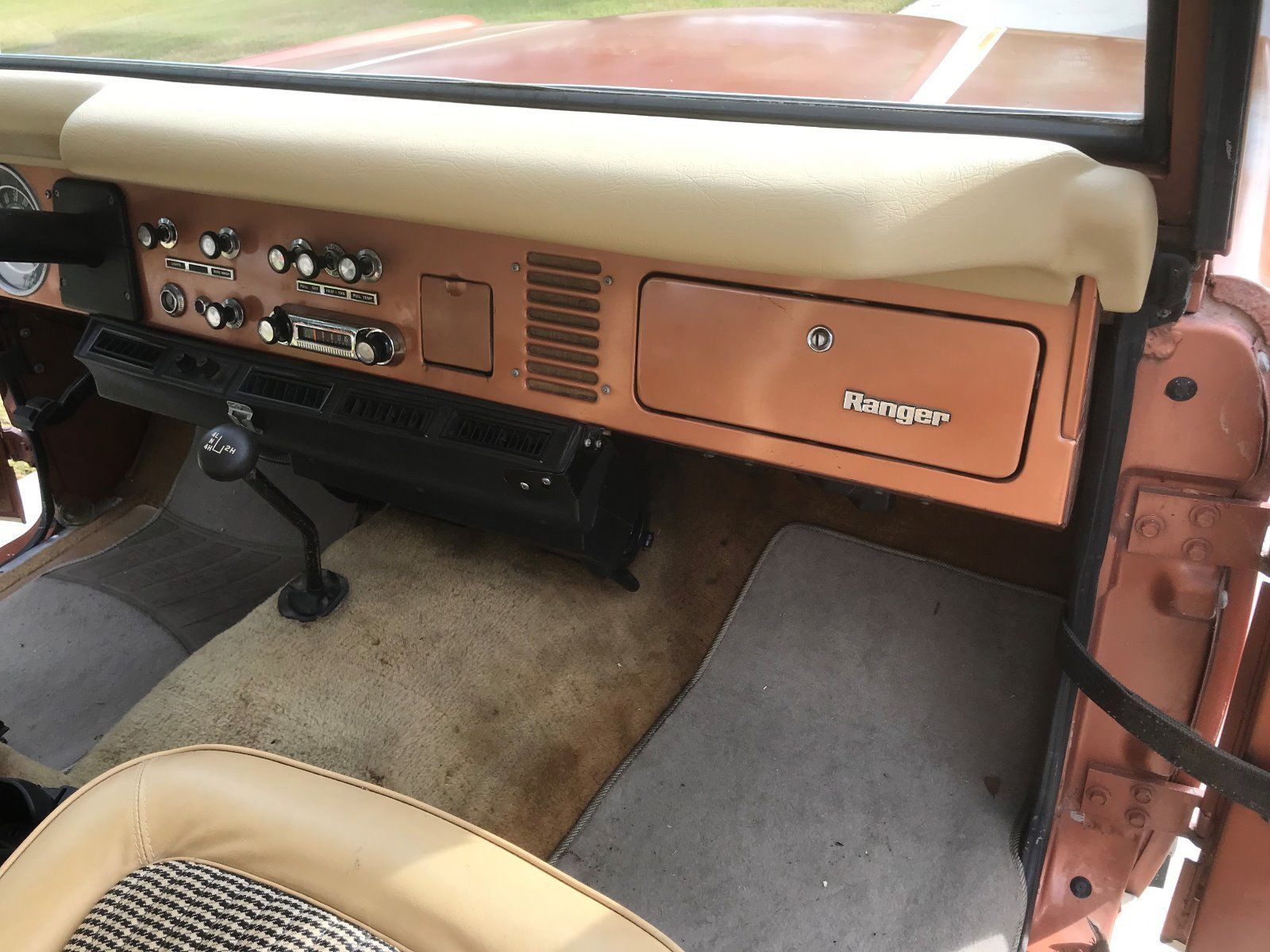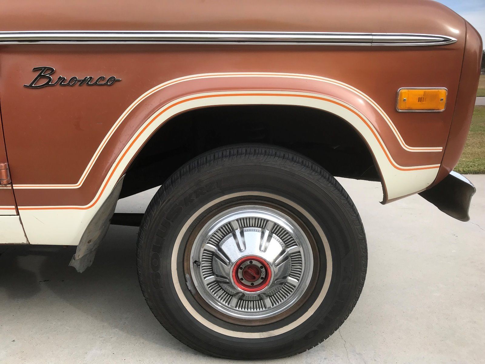 All original 1976 Ford Bronco Ranger package. Has factory A/C, power brakes with factory front discs, power steering. I am at least the 3rd owner so unsure of actual mileage but I have no reason to believe it is not the 83,000 shown. Runs very solid! All original! I even have the original key chain and keys from the dealer in Limon CO. I have owned for the past few years and installed a new headliner and dash pad cover. Recently replaced brake booster, spark plugs and carb. Replaced steering wheel with OEM replacement and removed smog pump but I still have the original steering wheel, carb and smog pump to go with the vehicle. Replaced the tire cover with a re-make but also have the original cover to convey. AM radio does not work but I have another used one to also go to the buyer. Fuel gauge does not work, No rust but does have some wear and tear, paint is patena-ed and decals weather cracked. the hub caps have a few dents and the "red centers" cracked on a couple of them. The right rear fender in front of the wheel slightly bent and the tailgate slightly bent in from a possible impact or push on the tire but does not affect ability to open tailgate, bumper corners slightly bent. On the interior the seats and carpet have 50 years of wear and tear. A PO has possibly repainted the top. PO had a soft top (not salvageable) with the vehicle and cut a slot on the wiper motor cover to fit the support bar. Tires in great shape but the suspension/shocks soft after 50 years. Driver "adjustable" mirror has a crack.