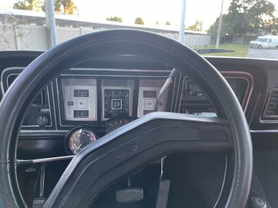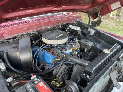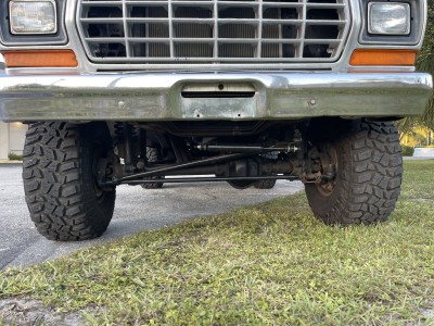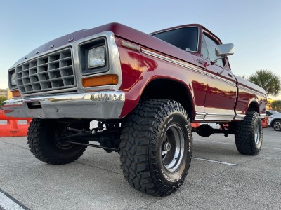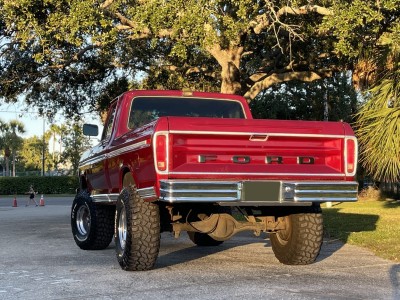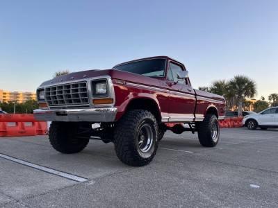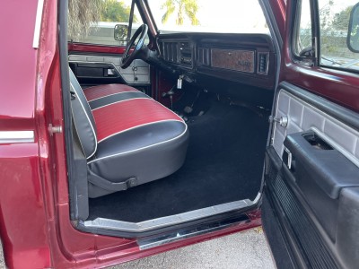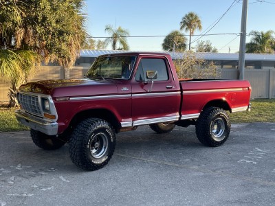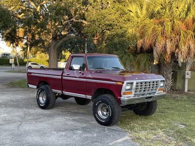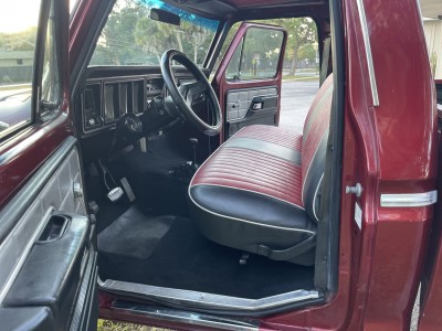 This 1979 Ford F-150 Ranger is a short-bed example that is finished in red over black and red vinyl and powered by a 400ci V8 paired with a three-speed automatic transmission and a two-speed transfer case. Equipment includes a lifted suspension, an aftermarket Kenwood stereo, a diamond-plate bed floor and rear bumper, power steering, power-assisted front disc brakes, a Holley carburetor, and 15″ Vision wheels with 35″ tires. The truck was acquired by the seller in February 2021 and service during current ownership reportedly included replacing the windshield and renewing the suspension, braking, ignition, and fueling components.
