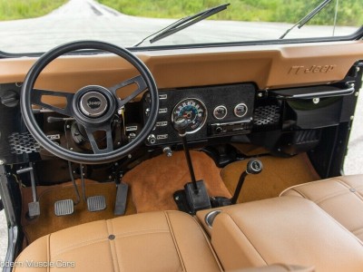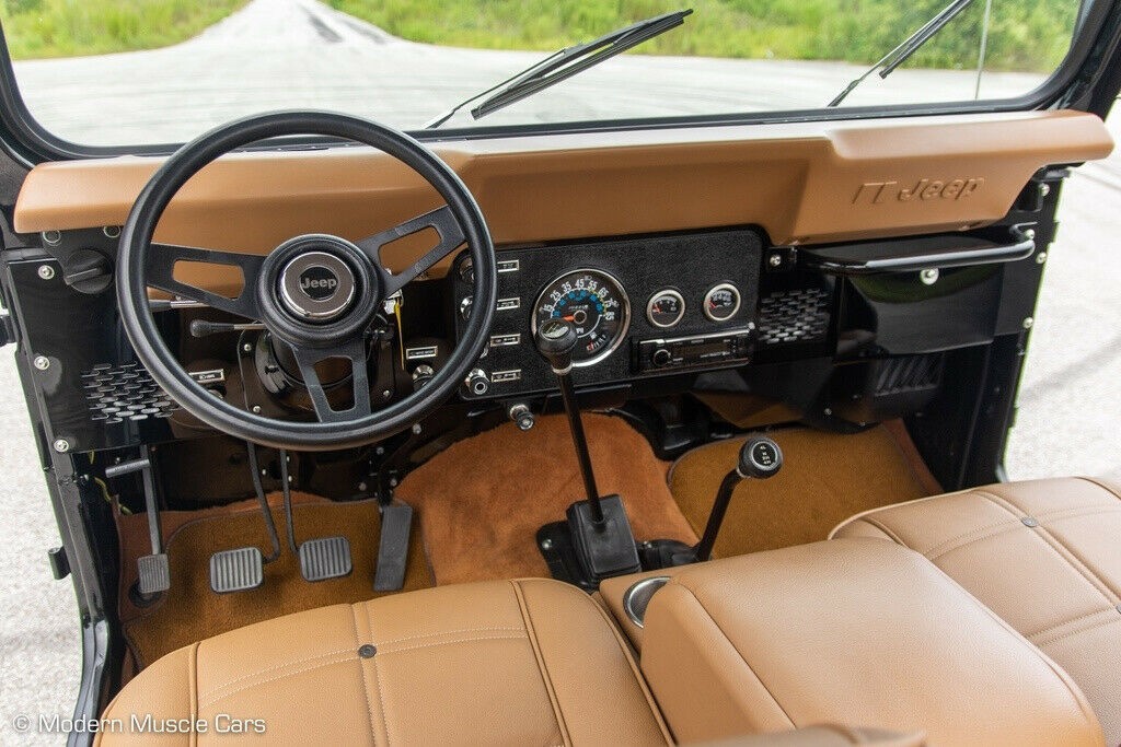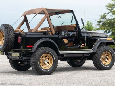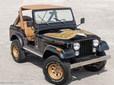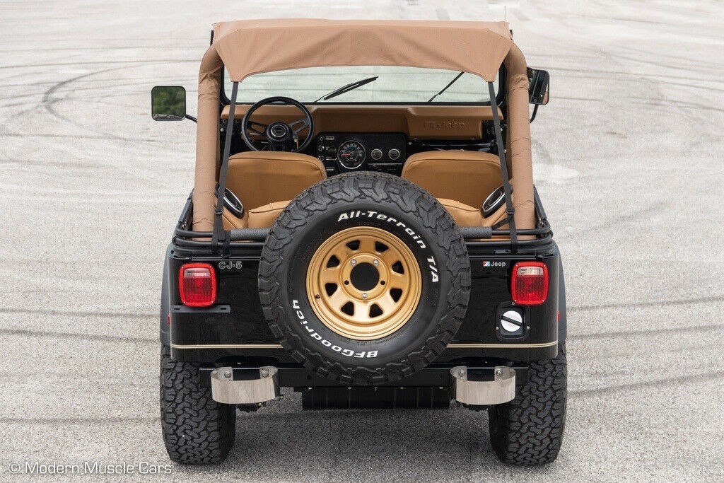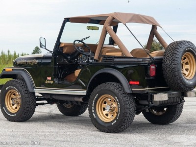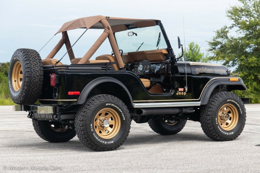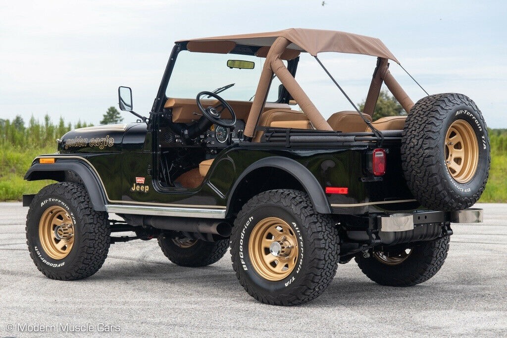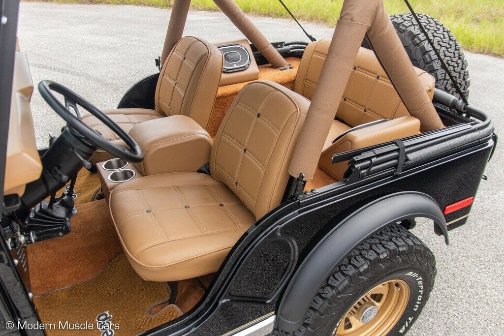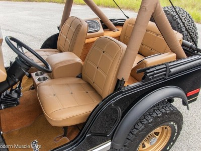 This 1980 Jeep CJ-5 is finished in black over a tan vinyl interior with Levi’s trim and is powered by an overbored 304ci V8 paired with a four-speed manual transmission and a two-speed transfer case. Features include Golden Eagle and Levi’s graphics, a Bestop vinyl top and half doors, a Kenwood head unit, steel wheels wearing 31? BFGoodrich tires, a Holley carburetor, and an Edelbrock aluminum intake manifold. The tan Bestop soft top and half doors feature plastic side and rear windows.