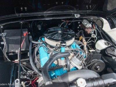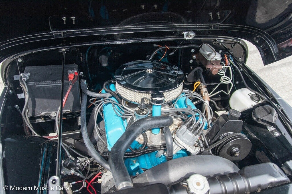 The cabin is painted black to match the exterior and features front bucket and rear bench seats upholstered in Levi’s-style vinyl with buttons by Kirk’s Kustom Upholstery of Corryton, Tennessee, as well as replacement tan carpets. Amenities include a center console with cup holders and a Kenwood head unit paired with speakers mounted in the dash and in enclosures on the rear wheel wells.