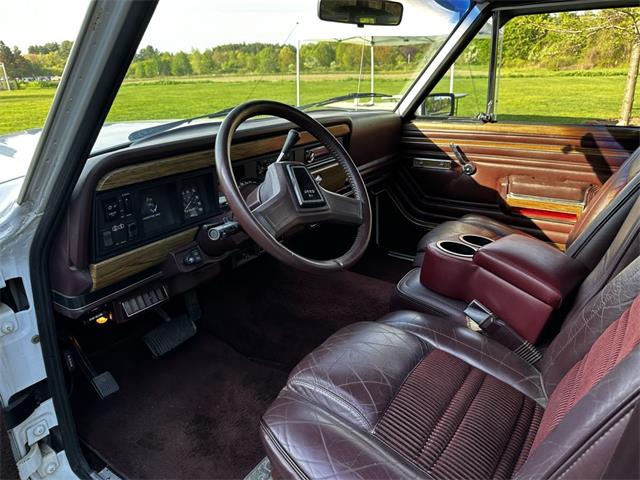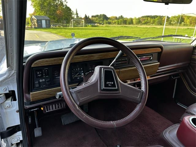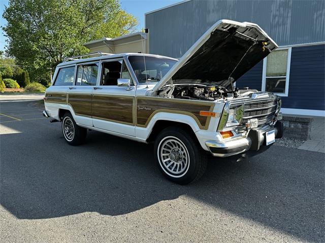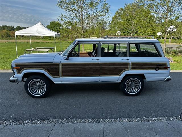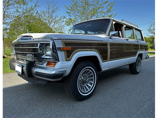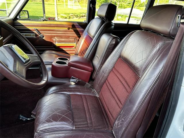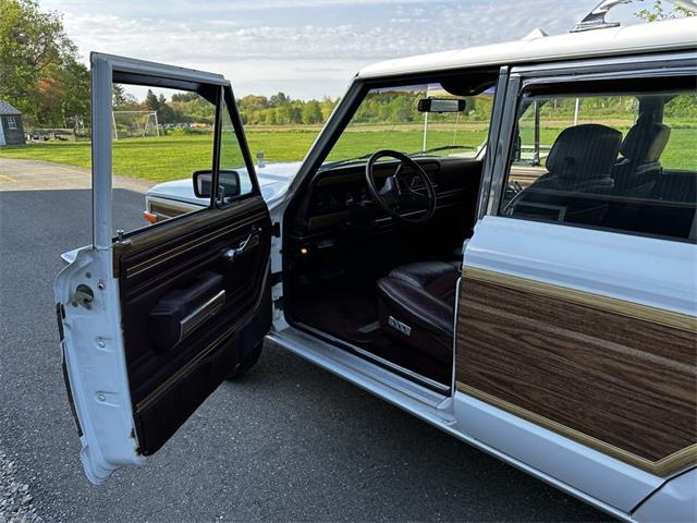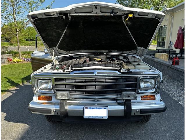 1990 Jeep Grand Wagoneer 4x4 with 66K original miles. From a small private collection in MA, this GW is a true V8 powered full size SUV in white with the iconic faux woodgrain accents running across the sides and rear, 15 inch aluminum wheels and chrome roof rack. Burgundy vinyl and cloth interior in excellent overall condition with minor wear only on the drivers seat as shown. Powered by the original 5.9-liter naturally aspirated V8 engine coupled to a three-speed automatic transmission and SelecTrac four-wheel drive. Many features including, factory fog lights, overhead console, air conditioning, power windows, power locks, power adjustable front seats, fold down rear seat, tow hitch, intact rear screen that works, after-market Kenwood stereo, aluminum bumper in excellent condition and much more. Clean undercarriage with solid frame with only typical surface rust evident. Full spare mounted underneath. Newer muffler and catalytic converter. All the badging and trim are intact and in great condition and all the chrome and aluminum bumpers are as well. This Grand Wagoneer runs, drives and handles excellent. Minor wear and scratches on veneer siding as shown with some some areas requiring re-glue.